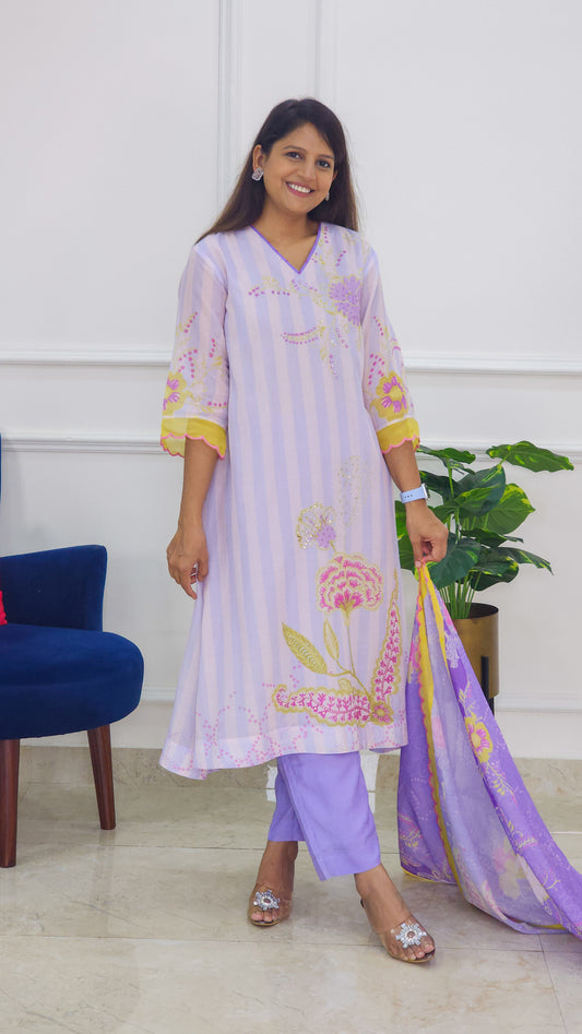 Lilac Stripe Embroidered Mul Chanderi Suit Set