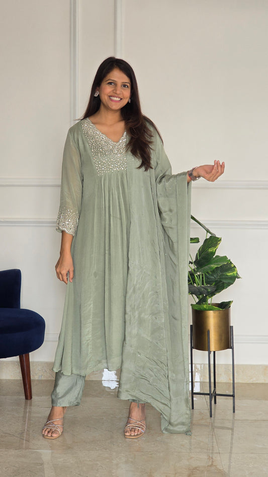 Tyohar ~ Mehendi Green Kali Top with Zardosi Work and Pallazo Set