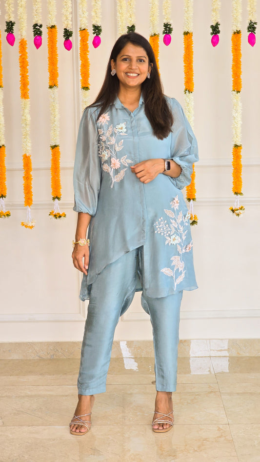 Aqua Blue Mul Chanderi Co Ord Set with Applique And Smock Detailing