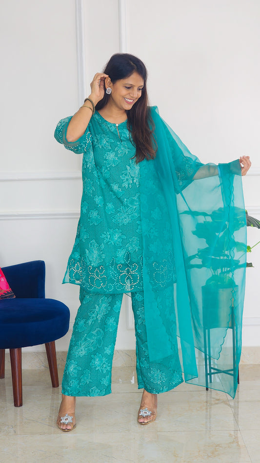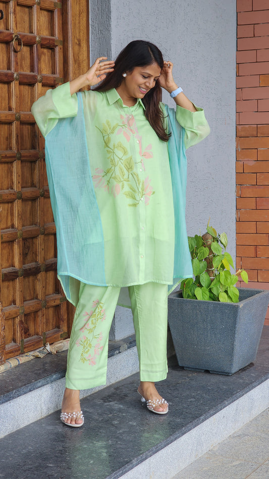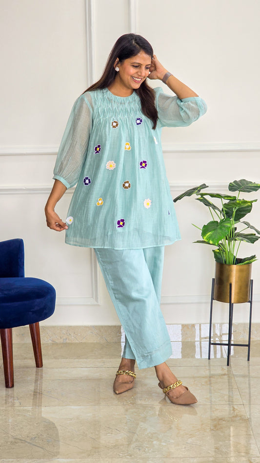 Aqua Blue Mul Chanderi Co Ord Set with Applique And Smock Detailing