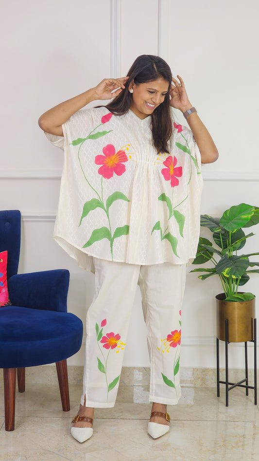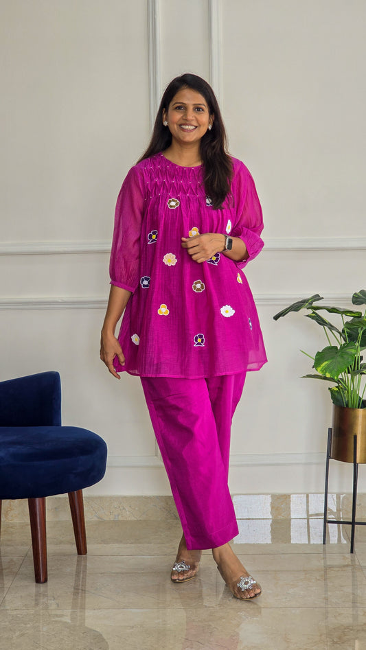 Magenta Mul Chanderi Co Ord Set with Applique And Smock Detailing
