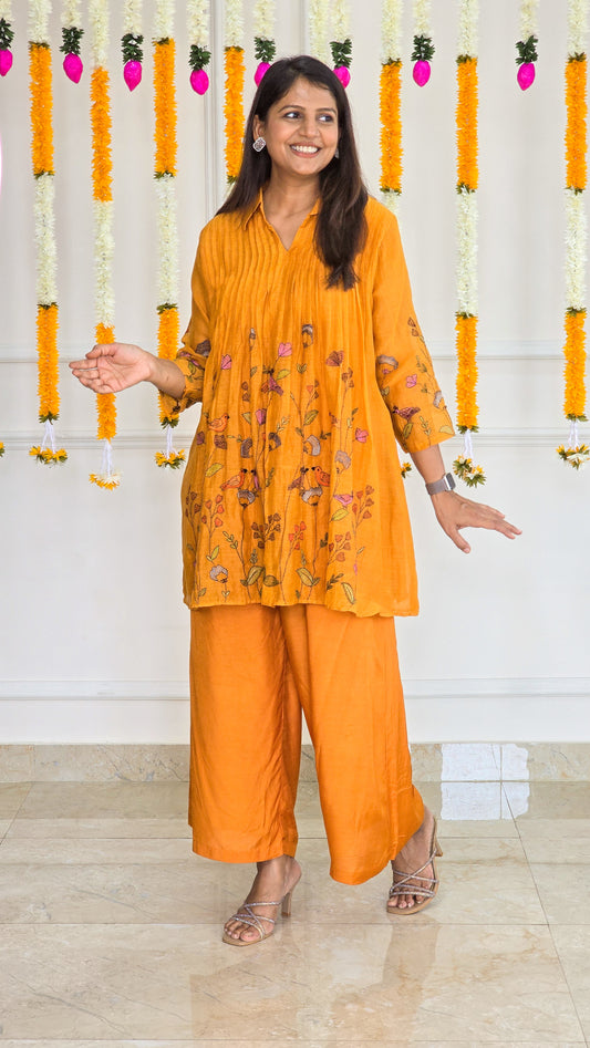 Ready To ShipGolden Flora Mustard Mul Chanderi Co-ord Set