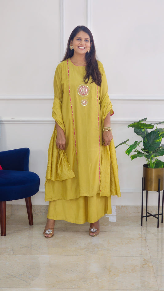 Yellow Embroidered Leheriya Kurta Set with Block Doriya Dupatta