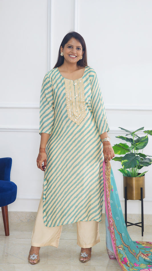 Ready To ShipTurquoise Leheriya Suit With Pichwai Dupatta