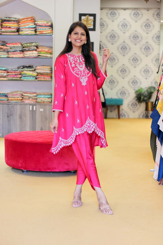 Magenta Mul Chanderi Co Ord Set with Applique And Smock Detailing