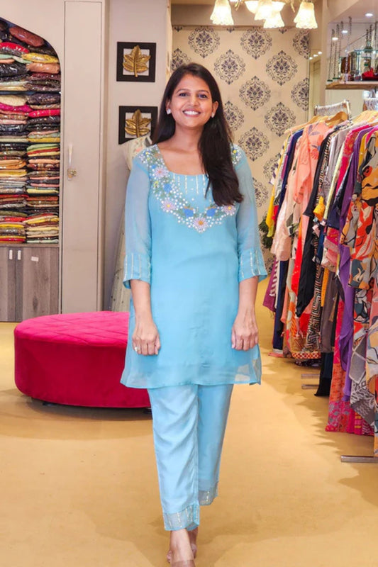 Turquoise Pure Soft Organza Mirror Embroidered Co Ord Set