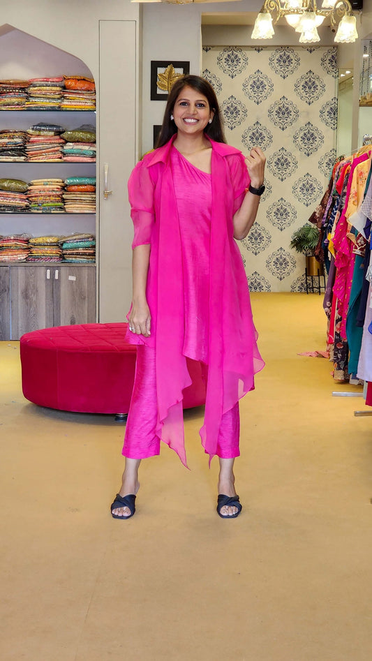 Fuchsia Organza Jacket with One Shoulder Top and Pants