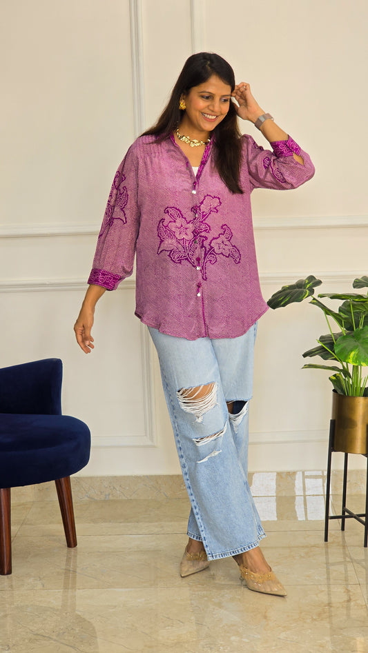 Ready To ShipPurple Bandhej Crepe Shirt
