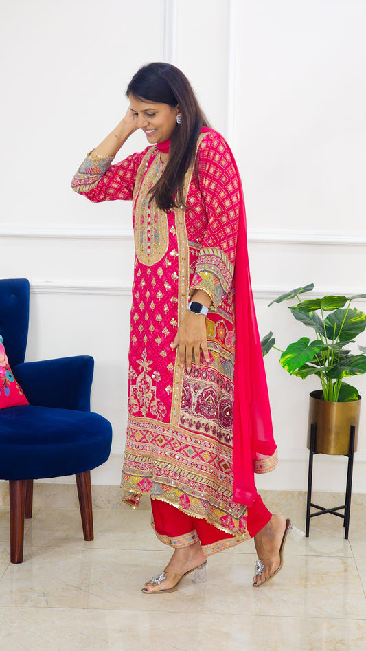 Rani Pink Bandhej Co Ord Set with Hand Work Detailing