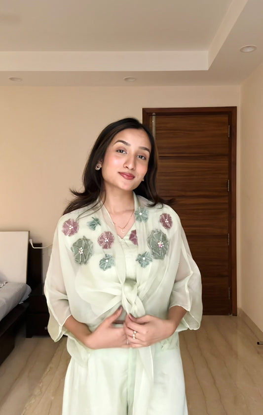 Ready To ShipPista Green 3D Flower Organza Jacket Set
