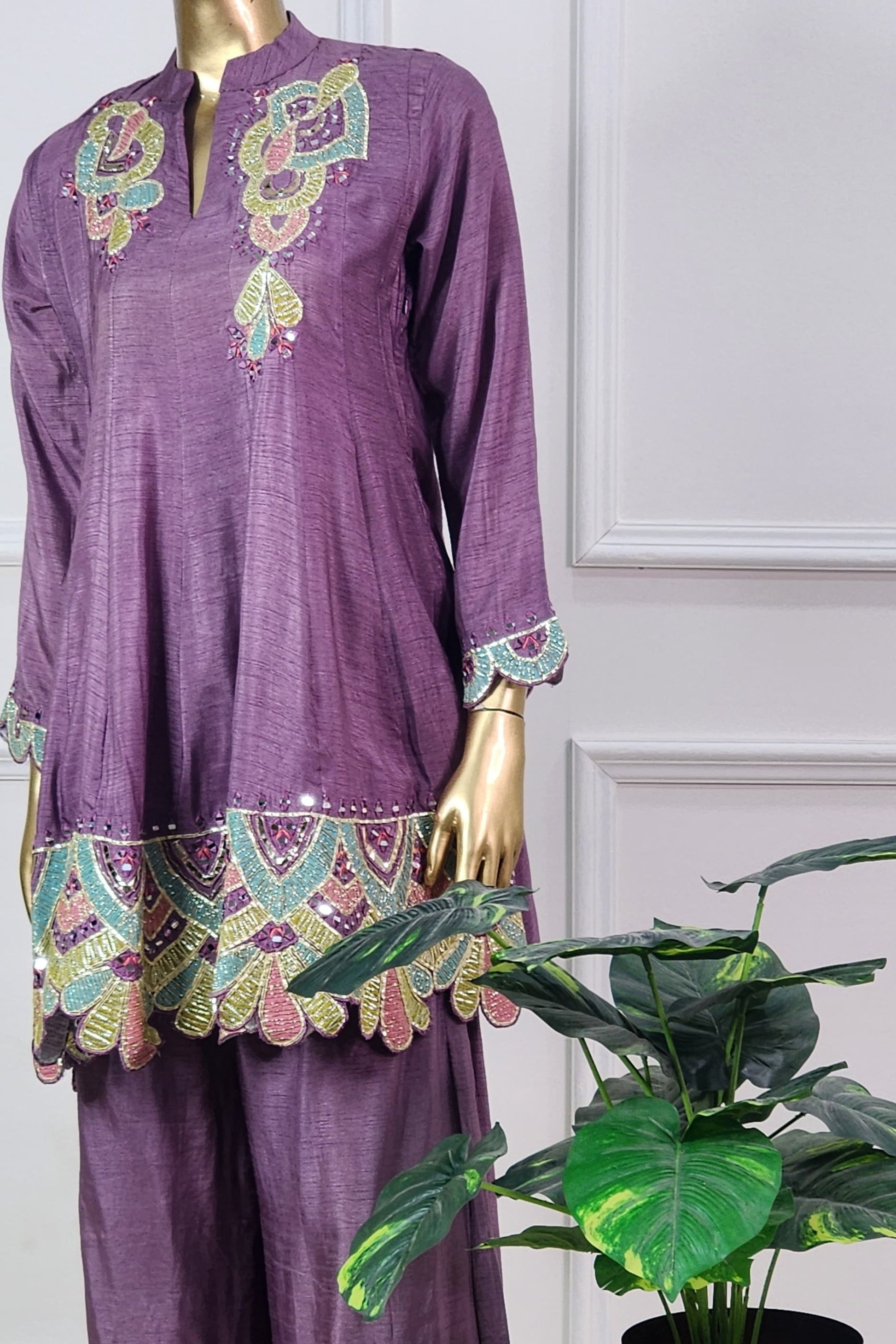 Seen here is a Dola silk top in an Anarkali pattern, adorned with delicate gota handwork, paired with flared pants — a graceful fusion of tradition and modern charm.