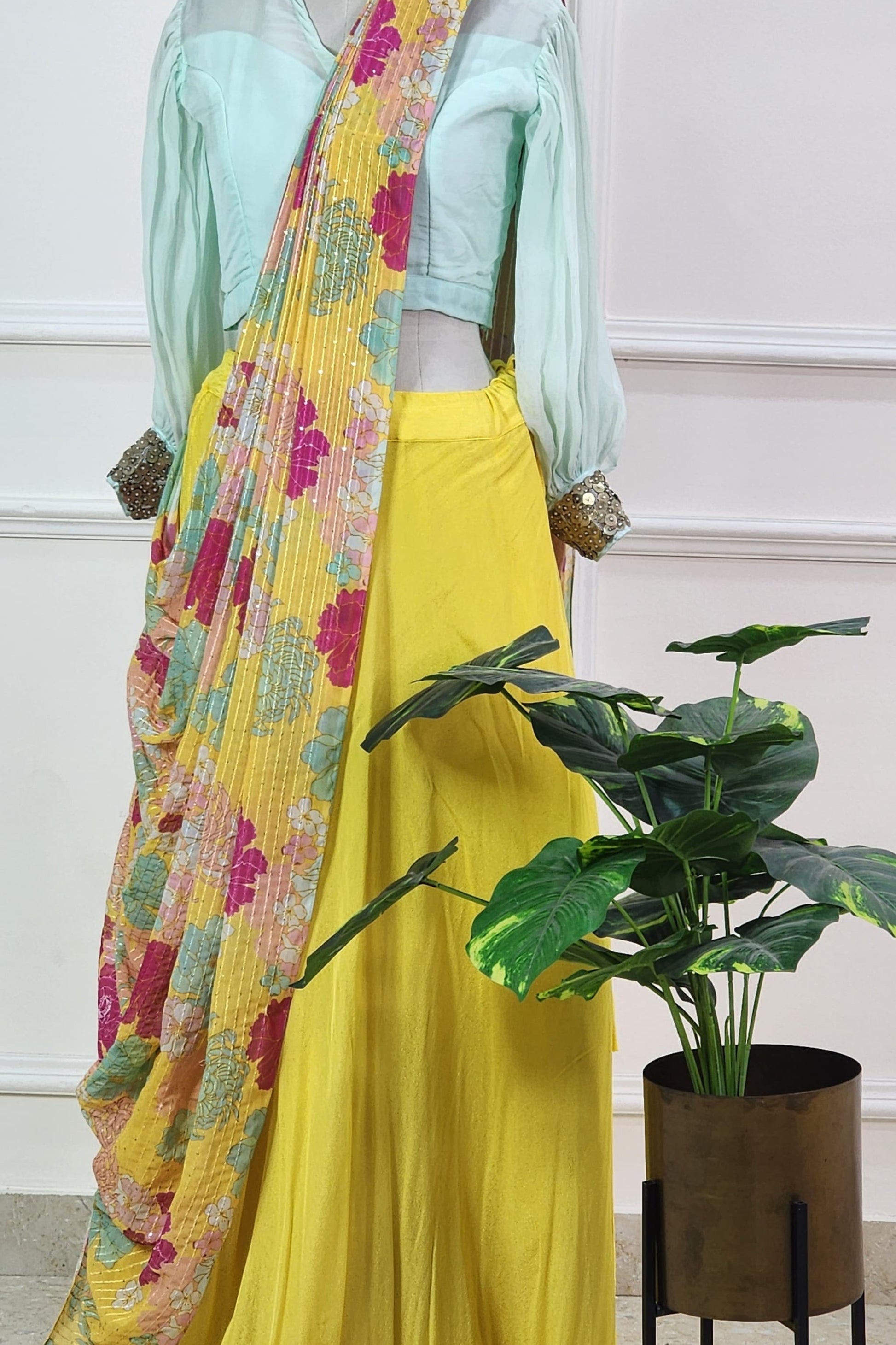 Seen here is a vibrant yellow floral dupatta paired with a blue blouse — a cheerful and stylish pick, perfect for haldi and carnival celebrations