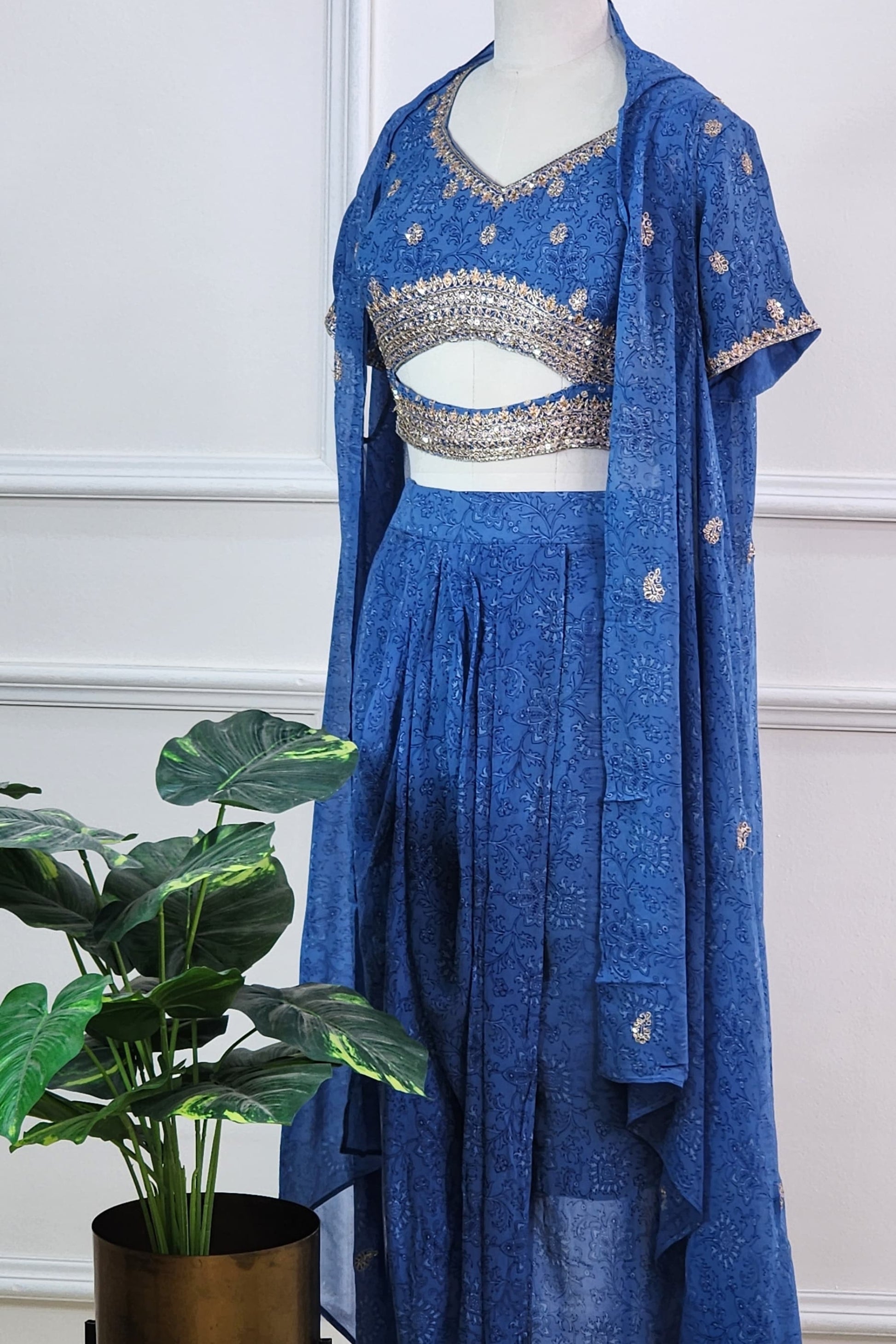 Seen here is a digital-printed georgette Indo-Western set — a breezy, contemporary look that blends tradition with modern elegance