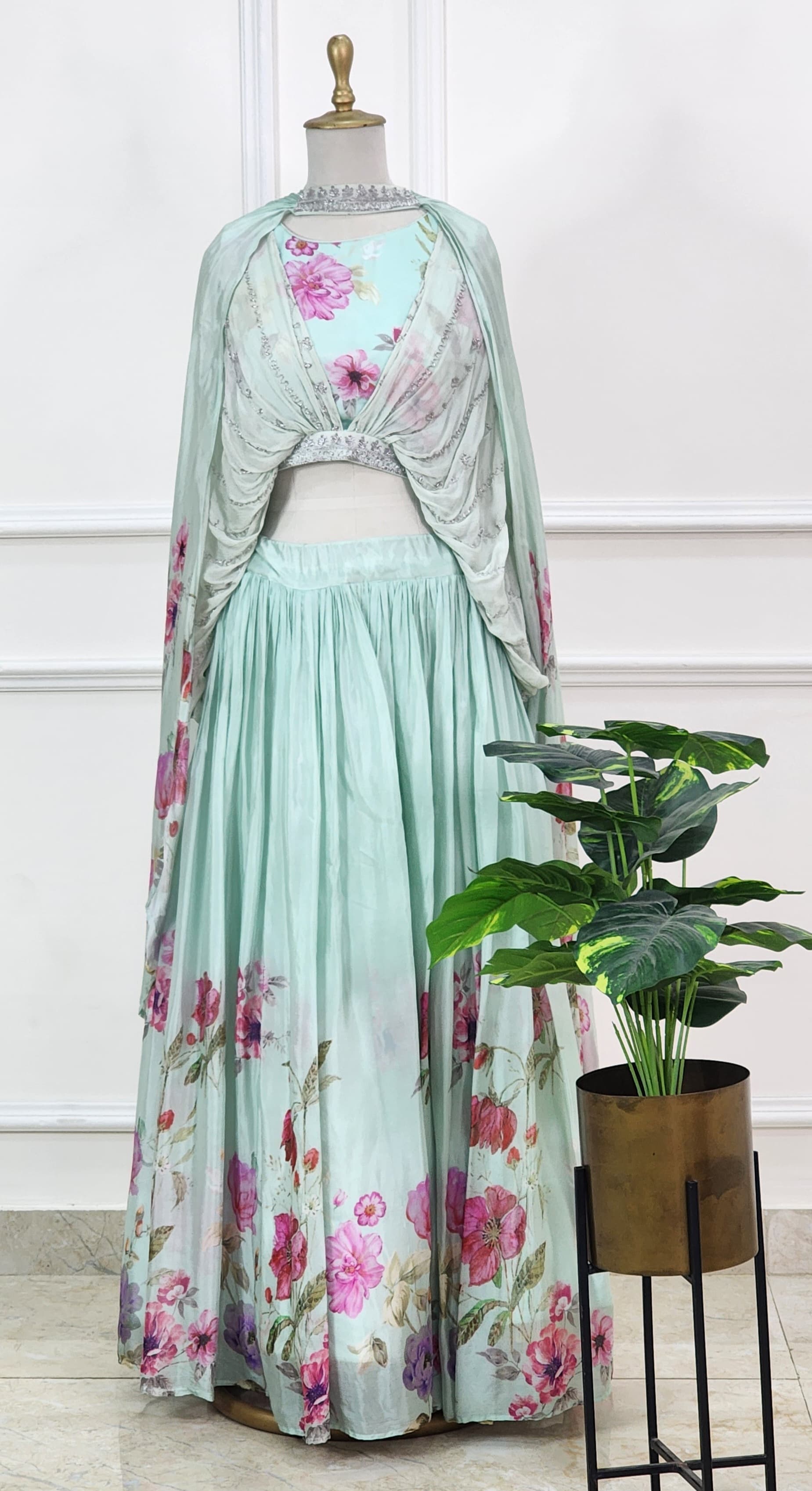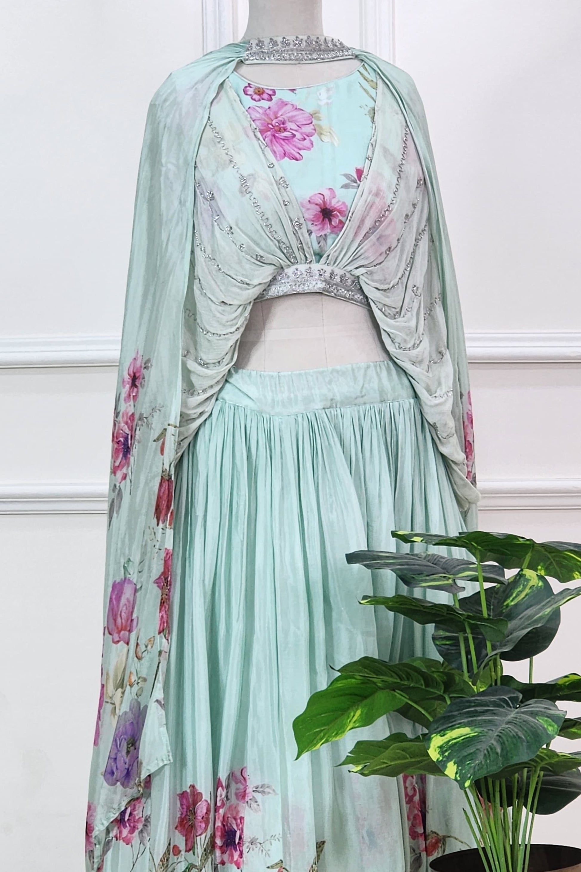 Seen here is a pastel-printed cape-style top paired with a matching skirt — breezy, elegant, and perfect for a modern festive look.
