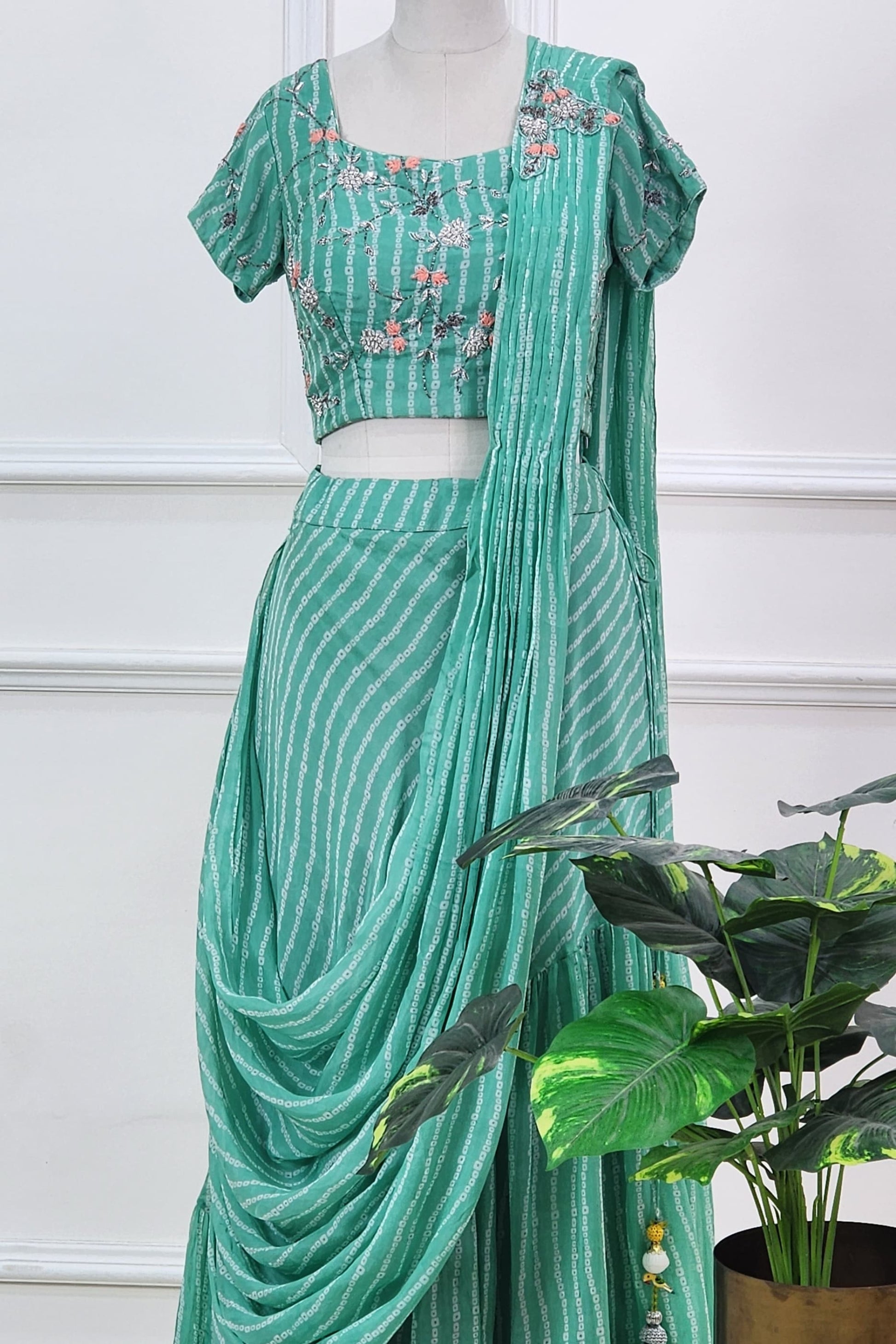 Seen here is a green bandhej satin lehenga set adorned with intricate handwork detailing — a beautiful blend of tradition and elegance