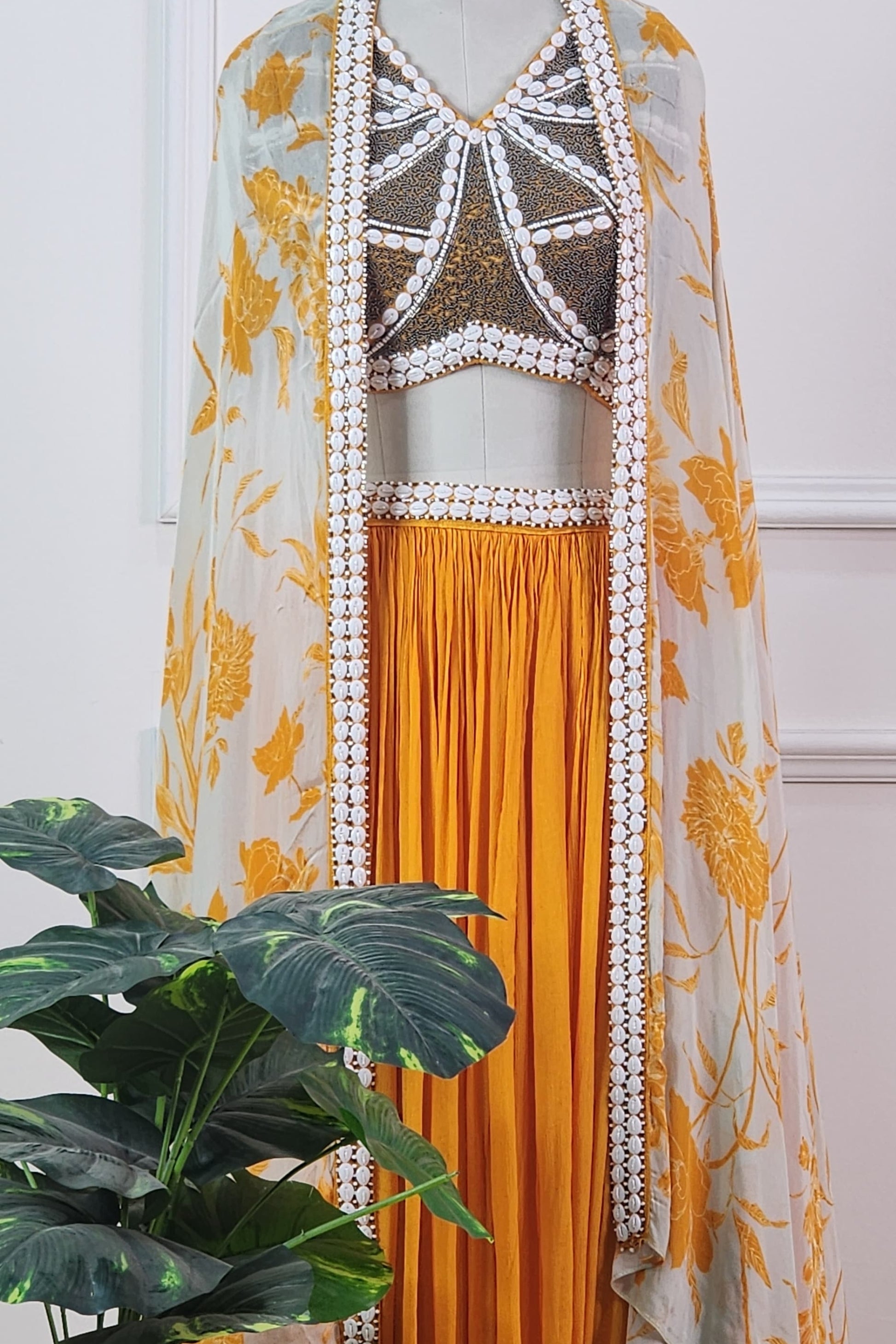 Seen here is a yellow floral dupatta paired with a handworked top and a plain skirt enhanced with cane for added flare — a delicate and graceful ensemble.