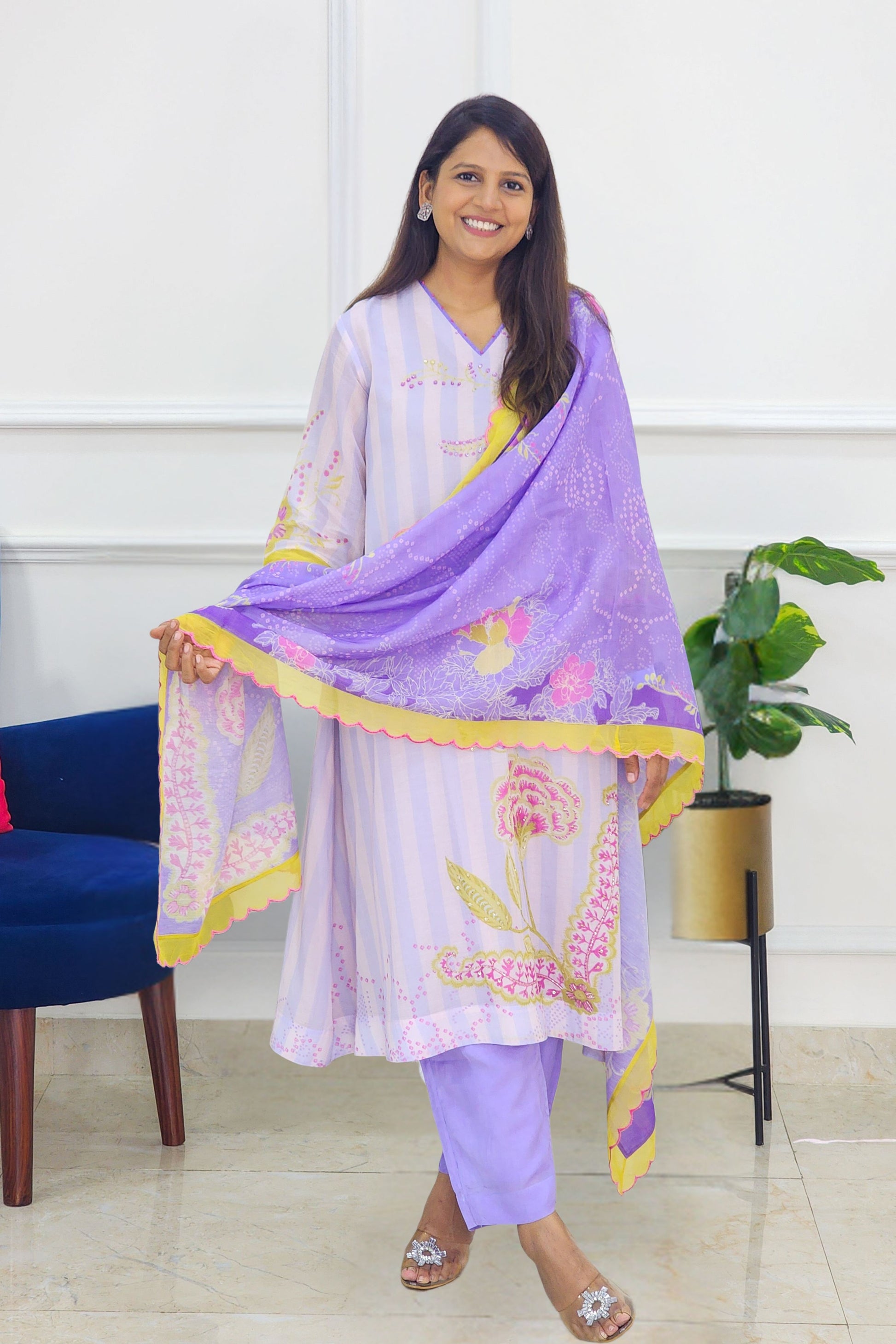 Lilac Stripe Embroidered Mul Chanderi Suit Set