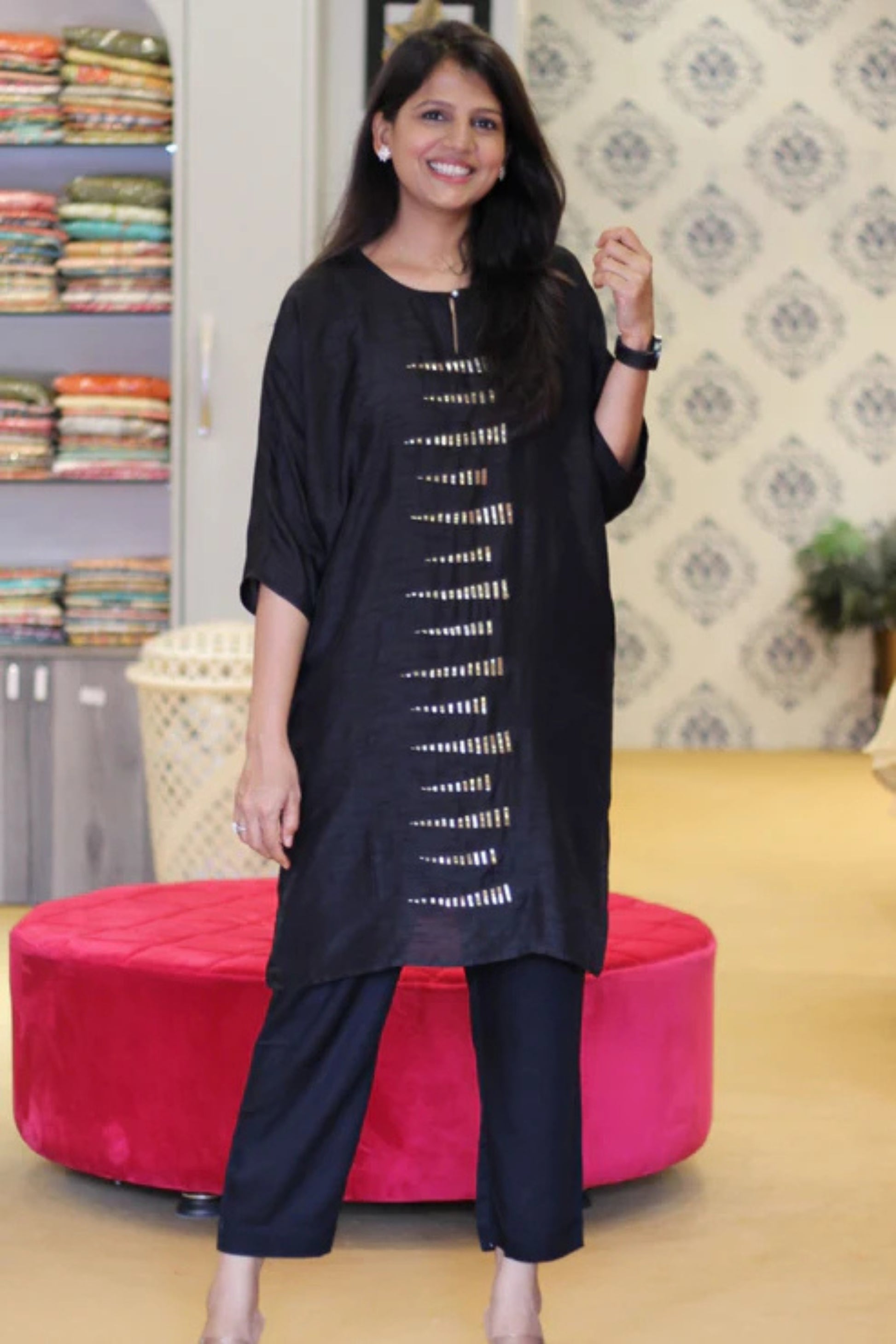 This is a free fitting kaftan top on dola silk fabric with hand work details. Pants on dola silk fabric.