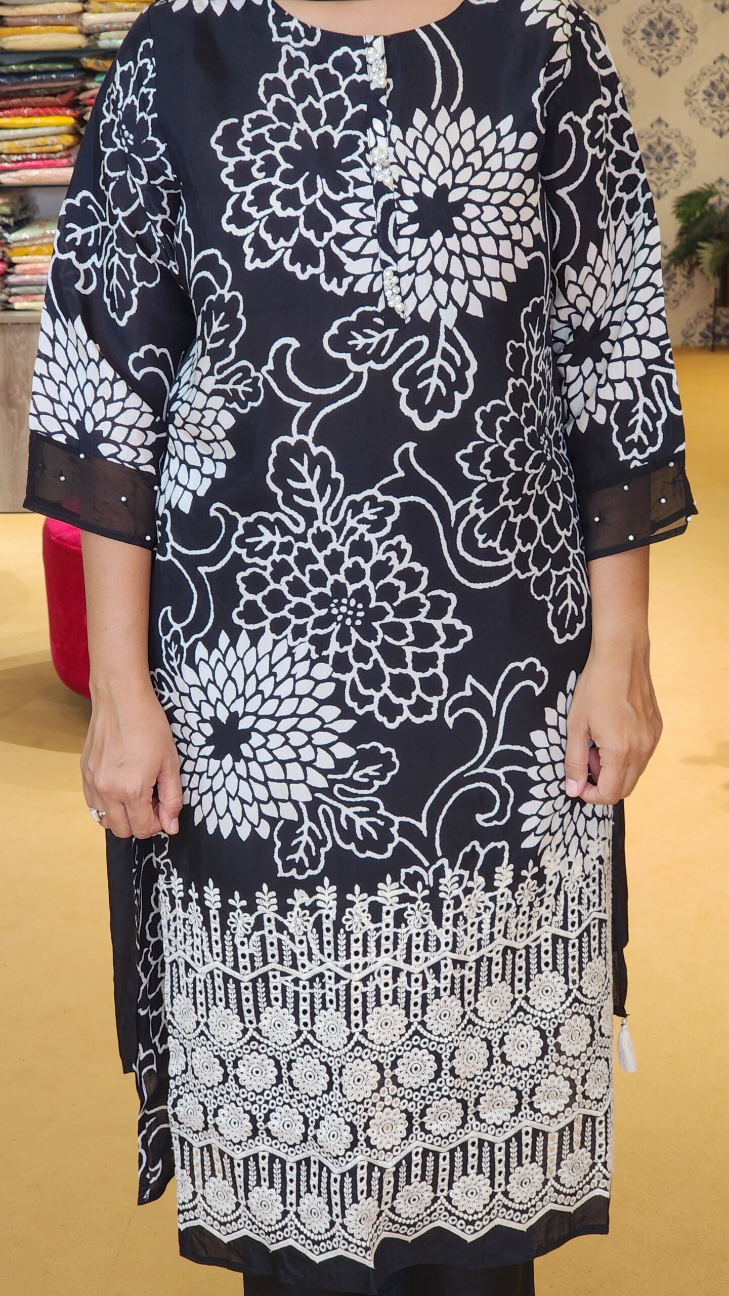 Here is black Printed Suit set with Schiffli details on hem, made on muslin fabric !