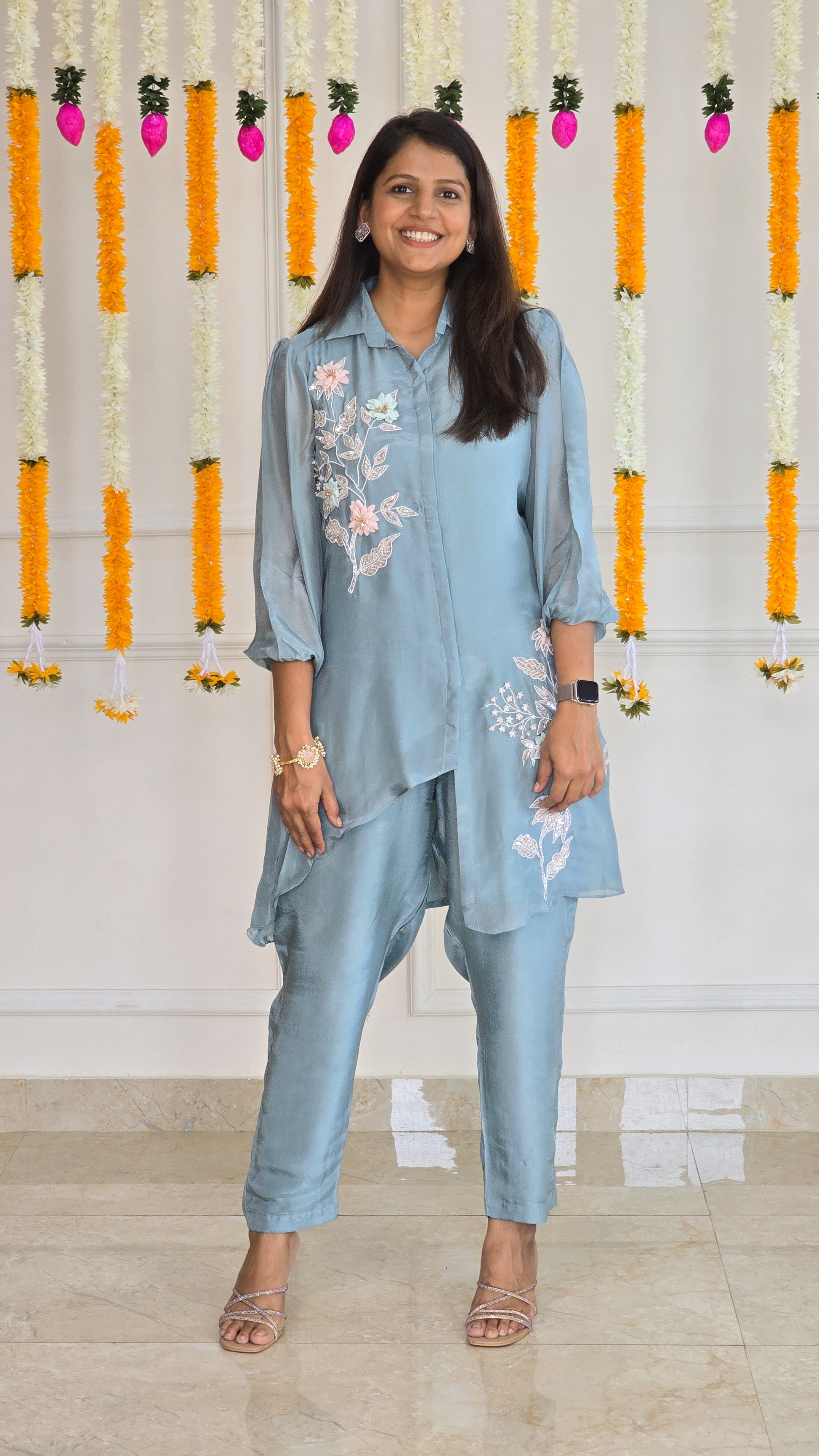 A serene blue co-ord set adorned with delicate 3D floral embriodery , blending elegance with comfort . The asymmetrical kurta and straight pants create a graceful , modern silhoutte perfect for festive or daytime occasions .