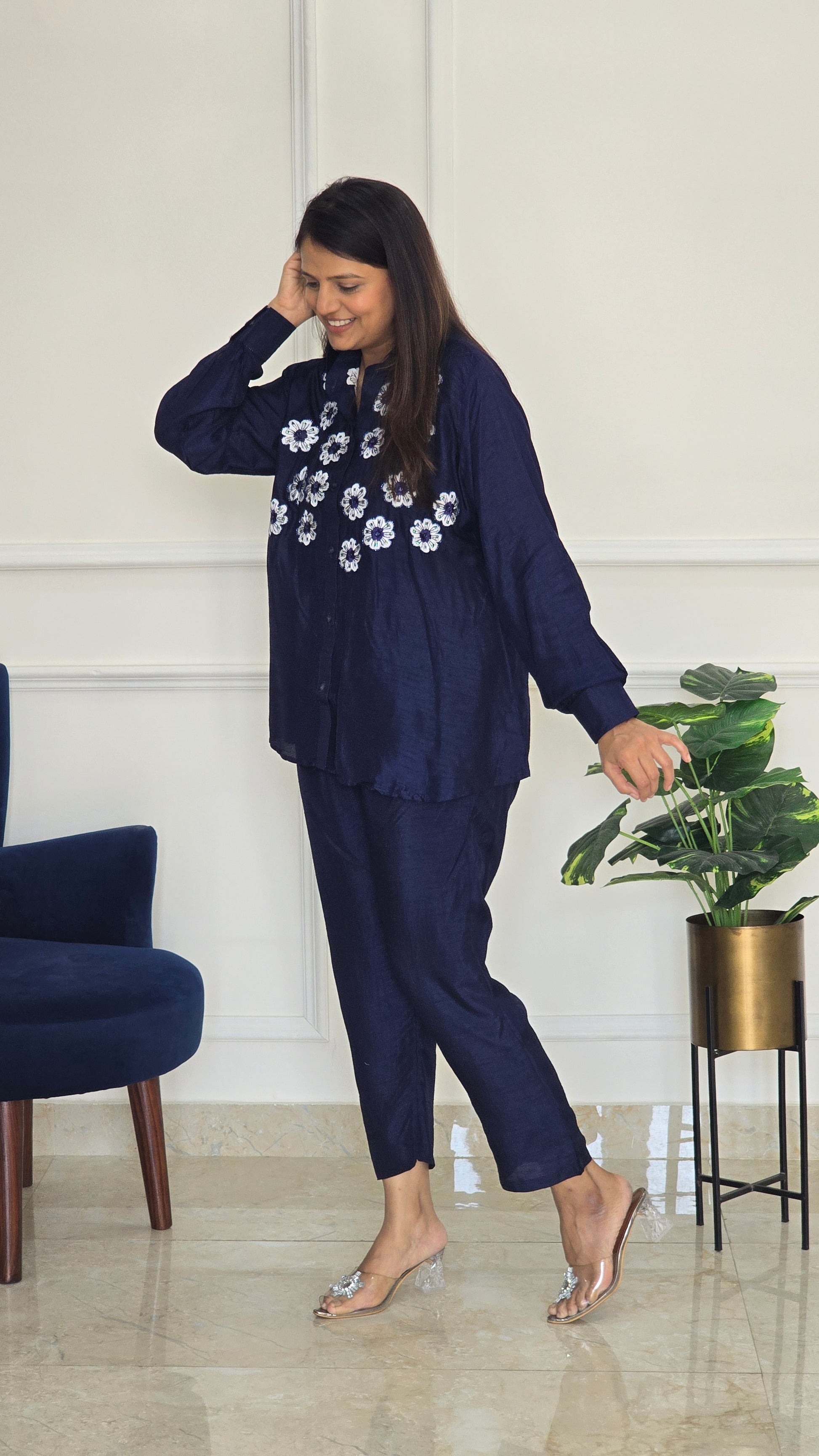Seen here is a blue co-ord set with white flower detailing !