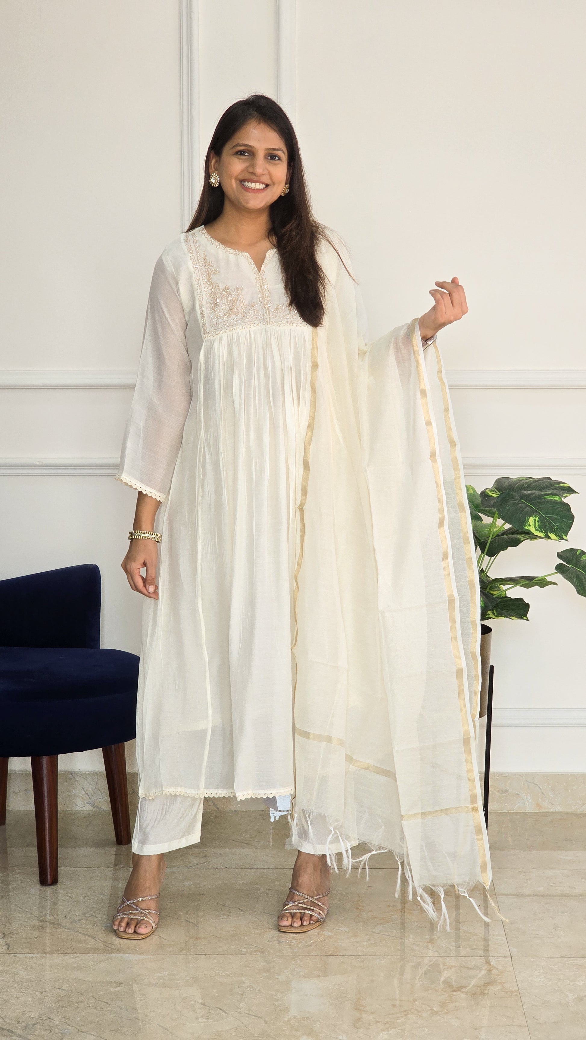 An elegant ivory kurta set featuring soft gathers, subtle tonal embroidery on the yoke, sheer sleeves, and a matching dupatta with gold detailing. A timeless and graceful pick for festive and everyday ethnic wear.