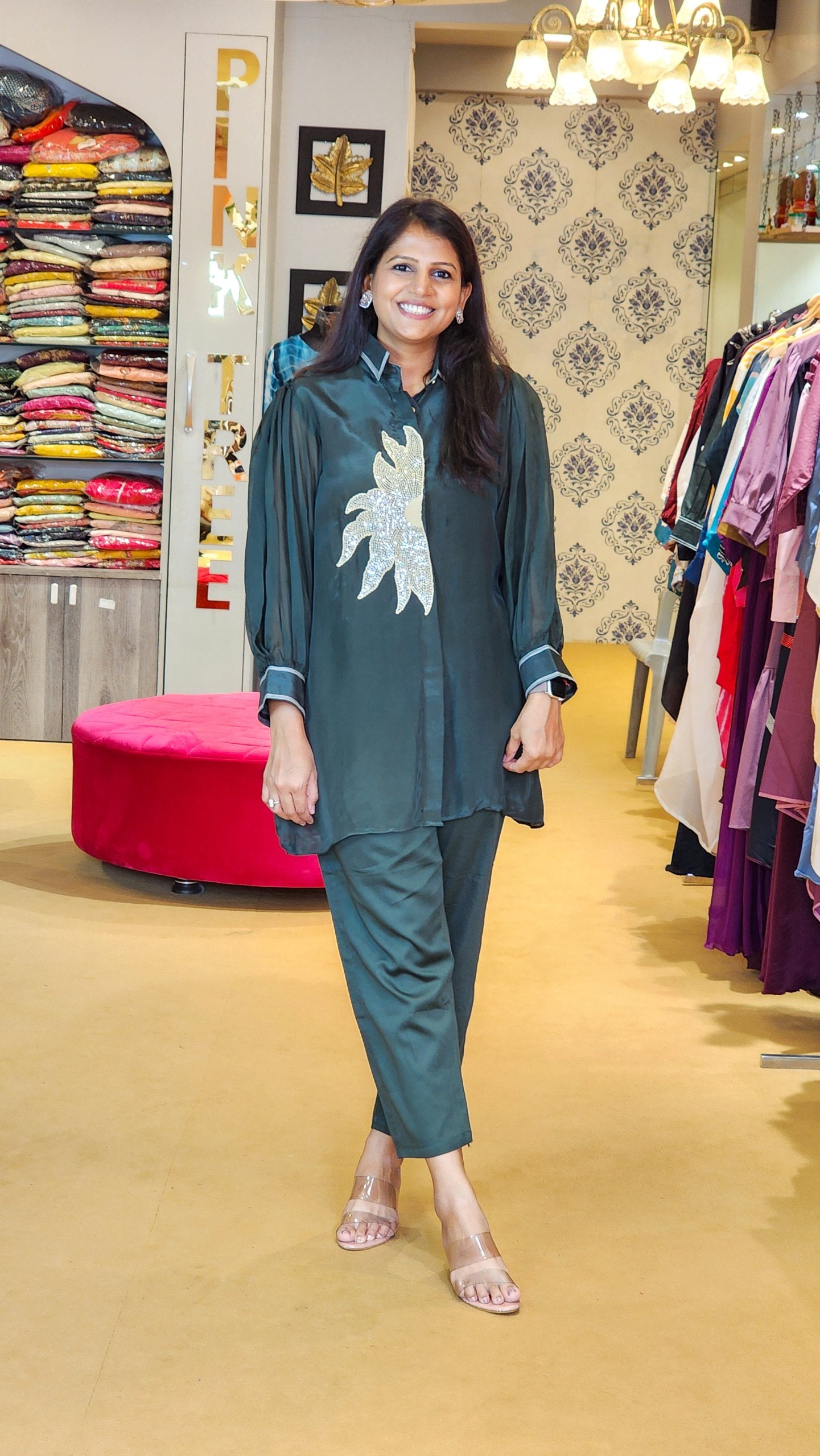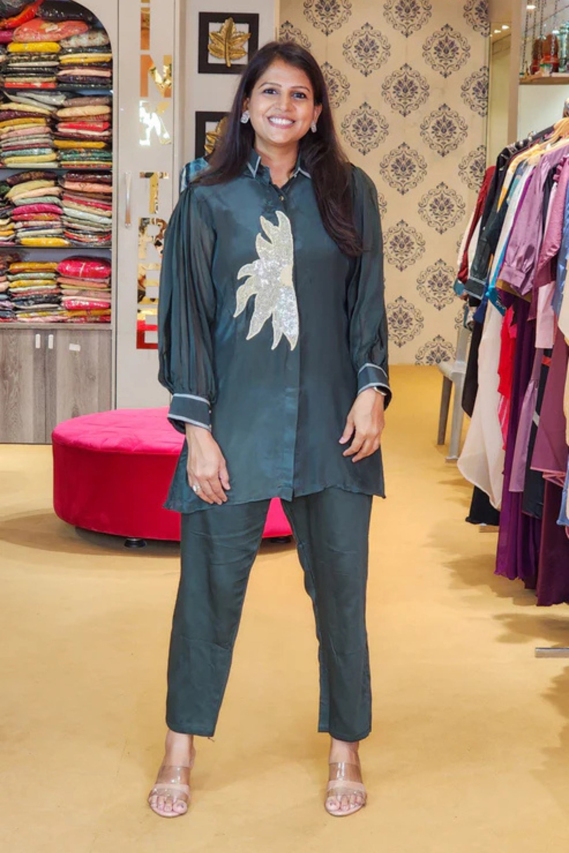 Seen here is crepe co ord set with sun flower embroidery !