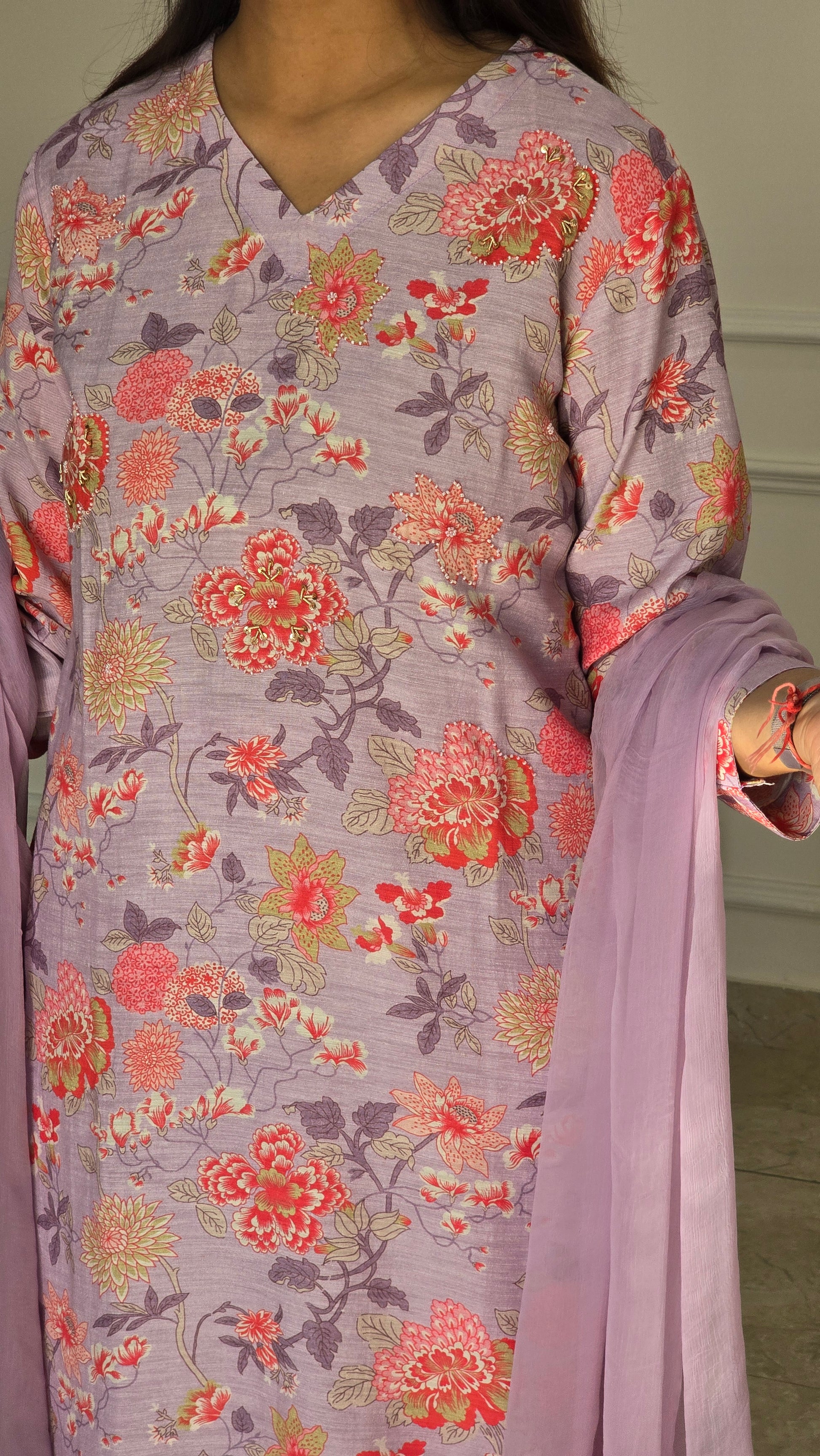 Seen here is a floral lilac suit set with handwork detailing !