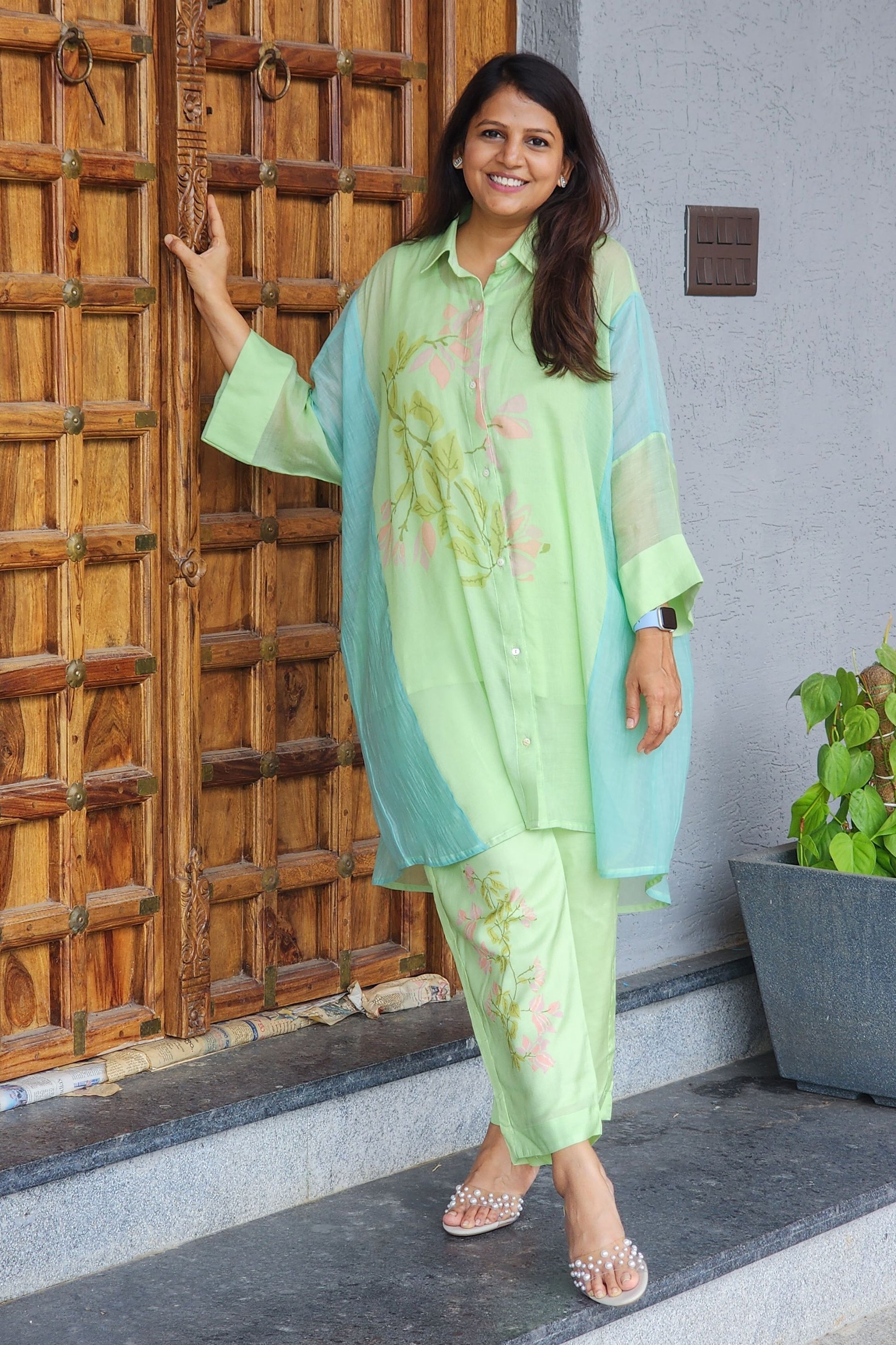 Green Floral Mul Chanderi Kaftan Set