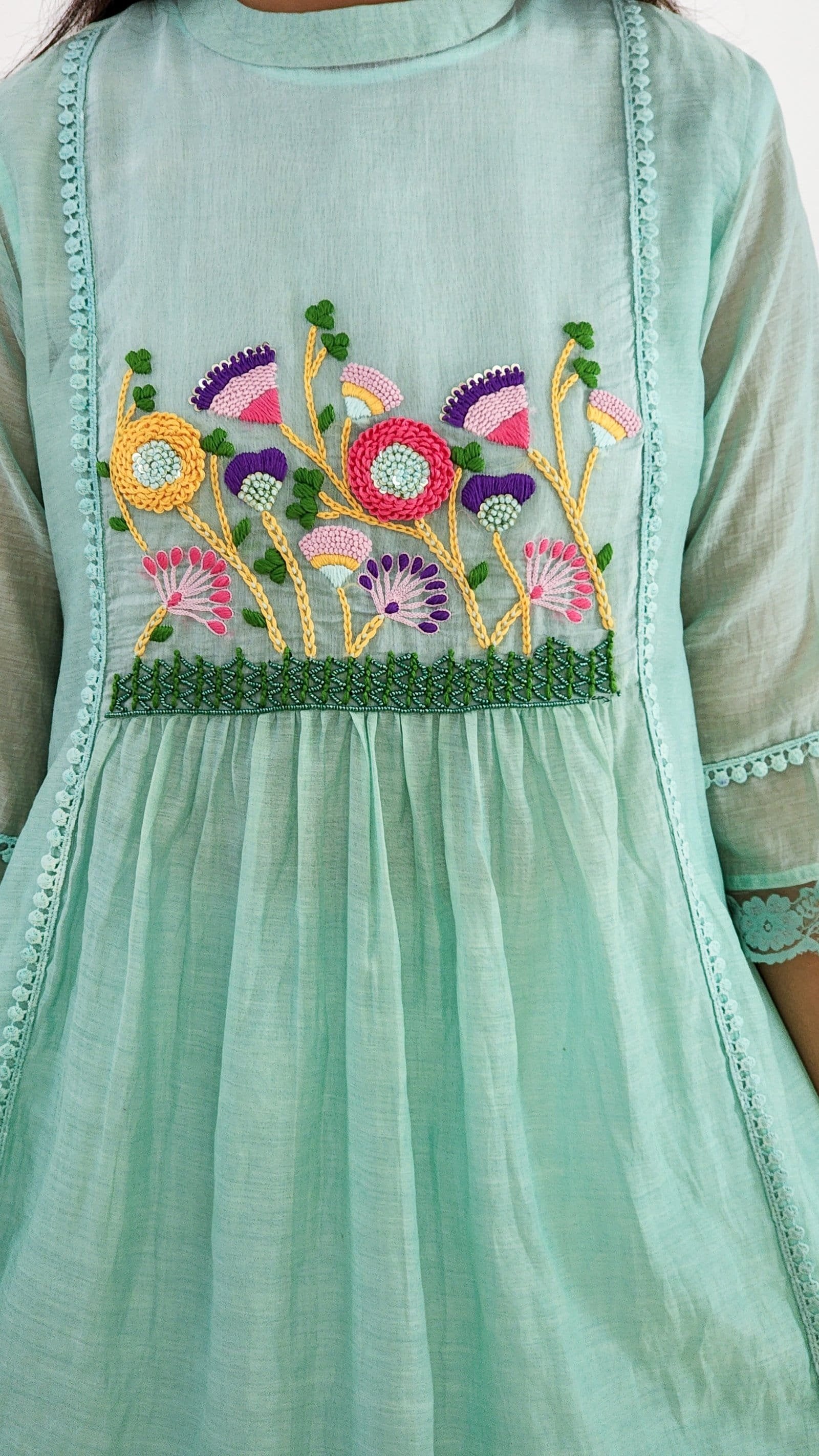Introducing our exquisite Mul Chanderi Flared Tunic Ensemble, designed to elevate your style with its elegant craftsmanship and thoughtful details. Hand Embroidery featuring garden details comes with cotton inner and pants !