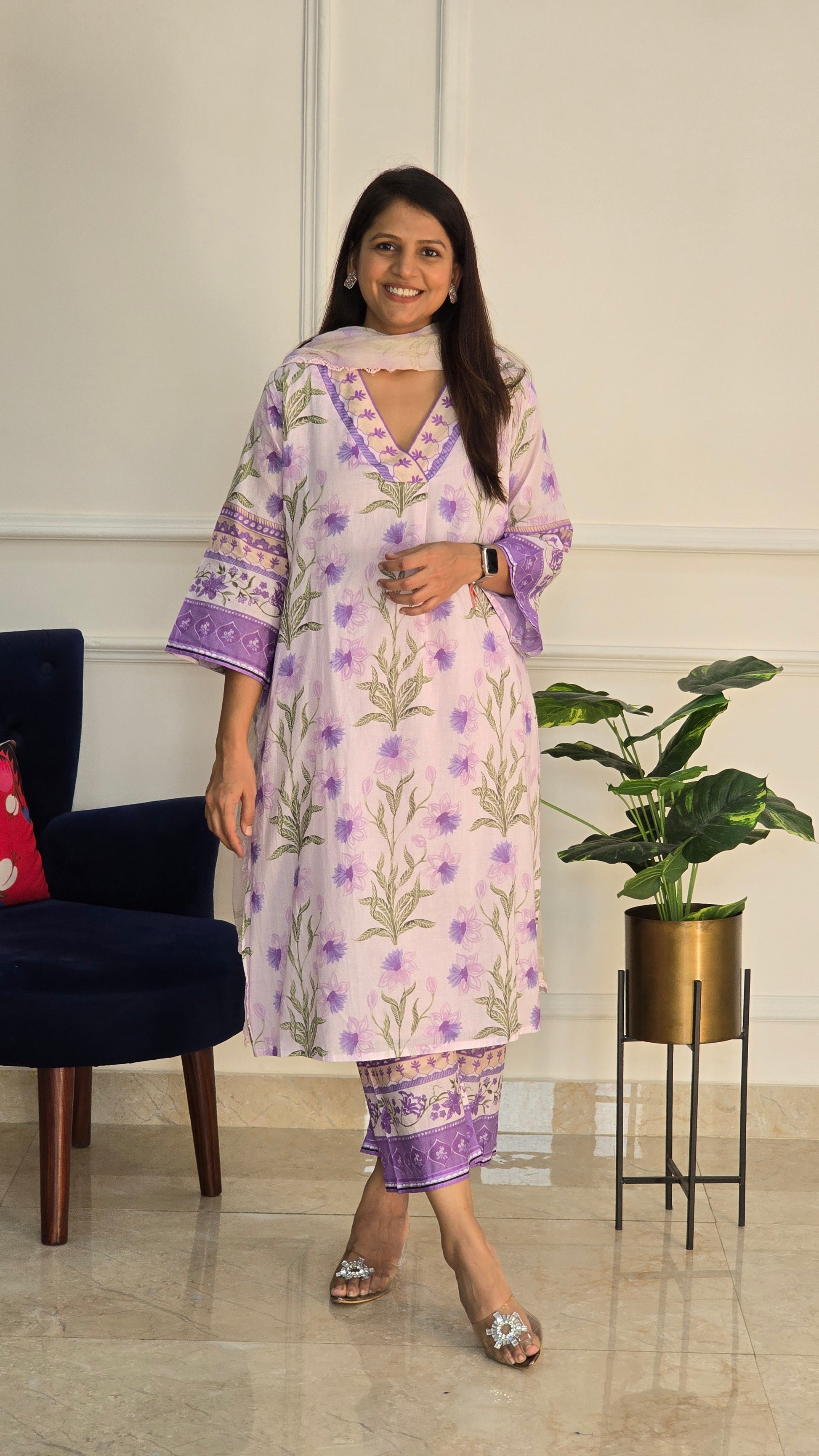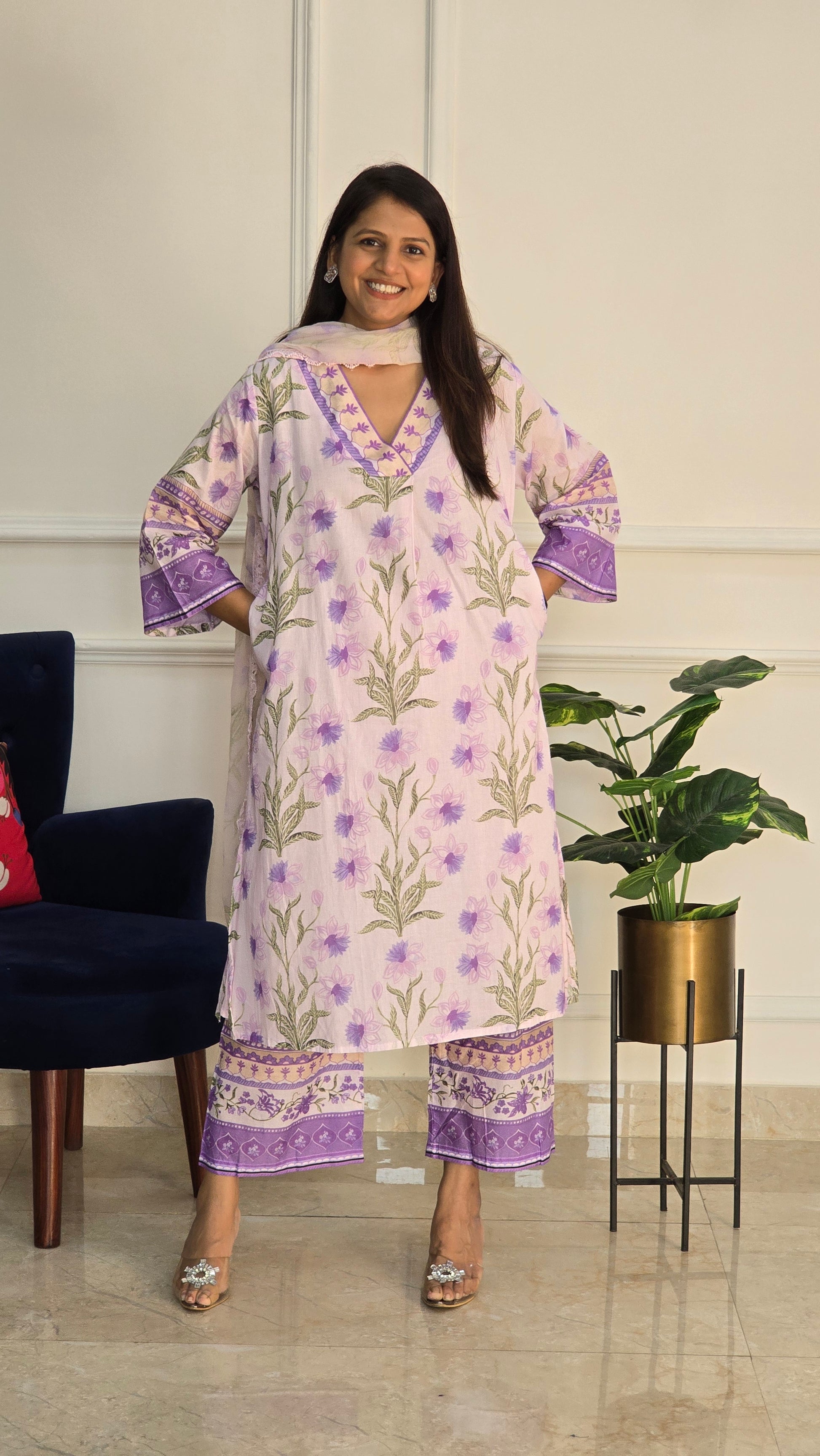 Floral garden print on Premium cotton feels like mul comes with a pure printed organza duppata and printed pants! (Kurta has attached lining)
