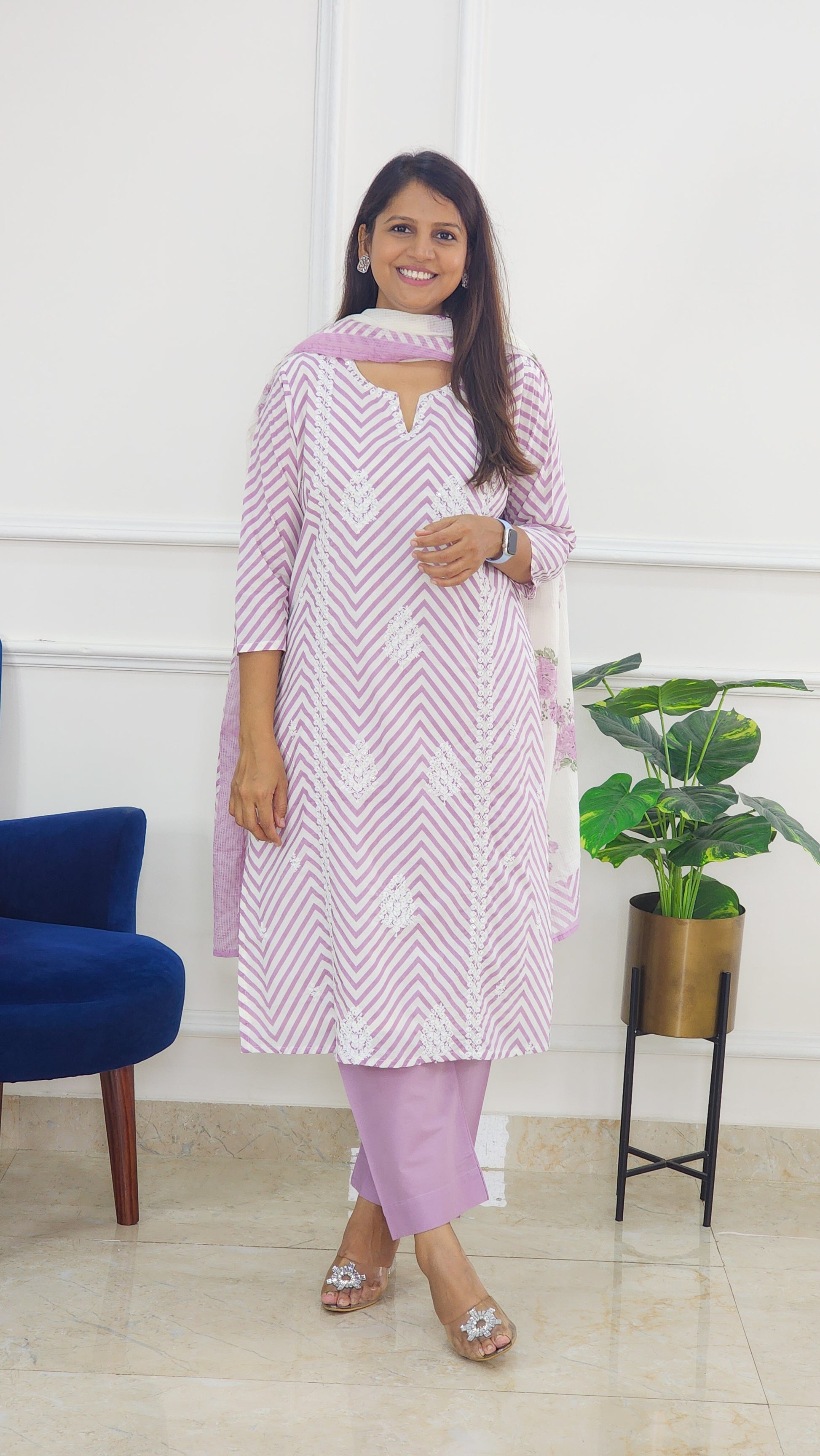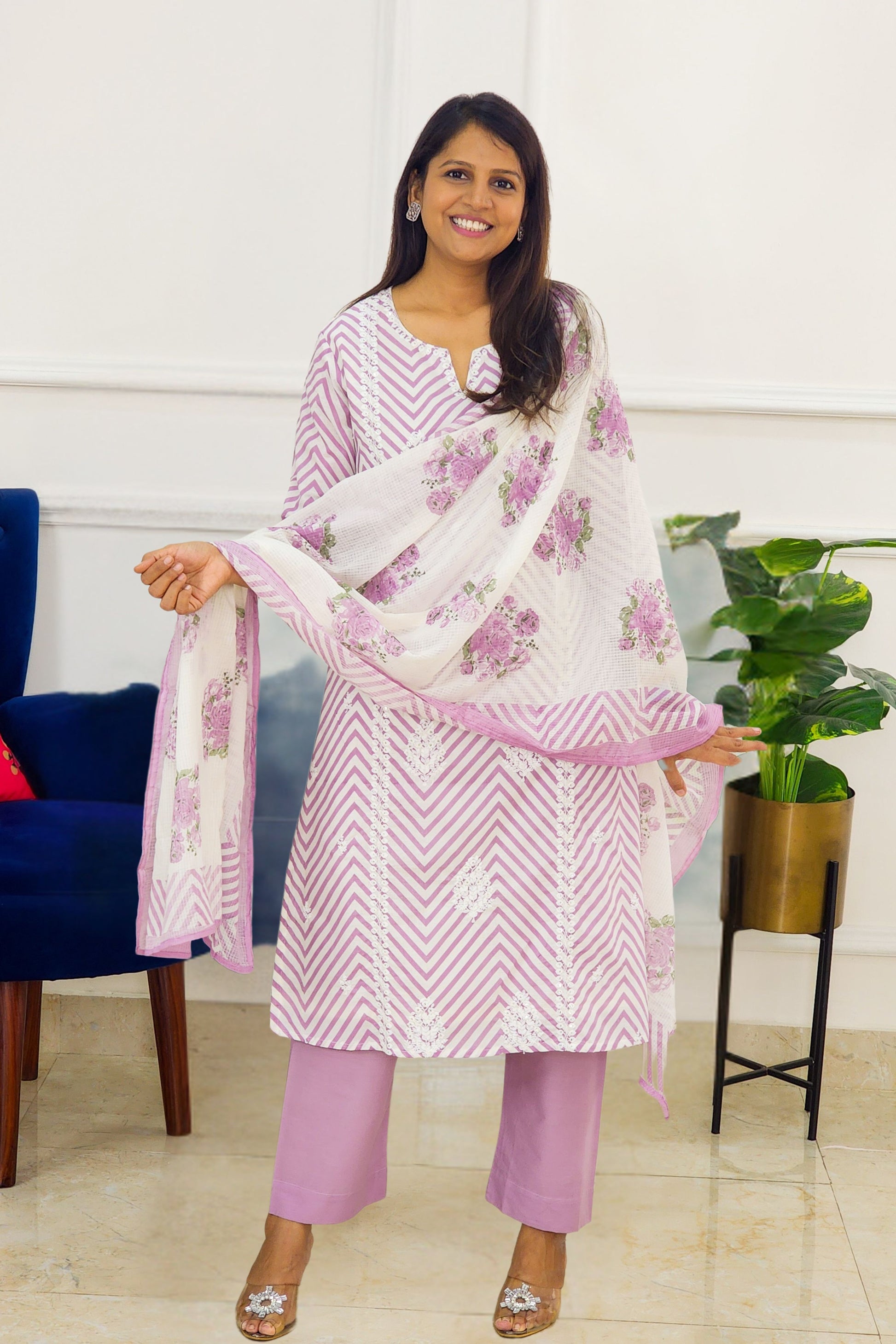 Lilac Embroidered Leheriya Kurta Set with Block Doriya Dupatta