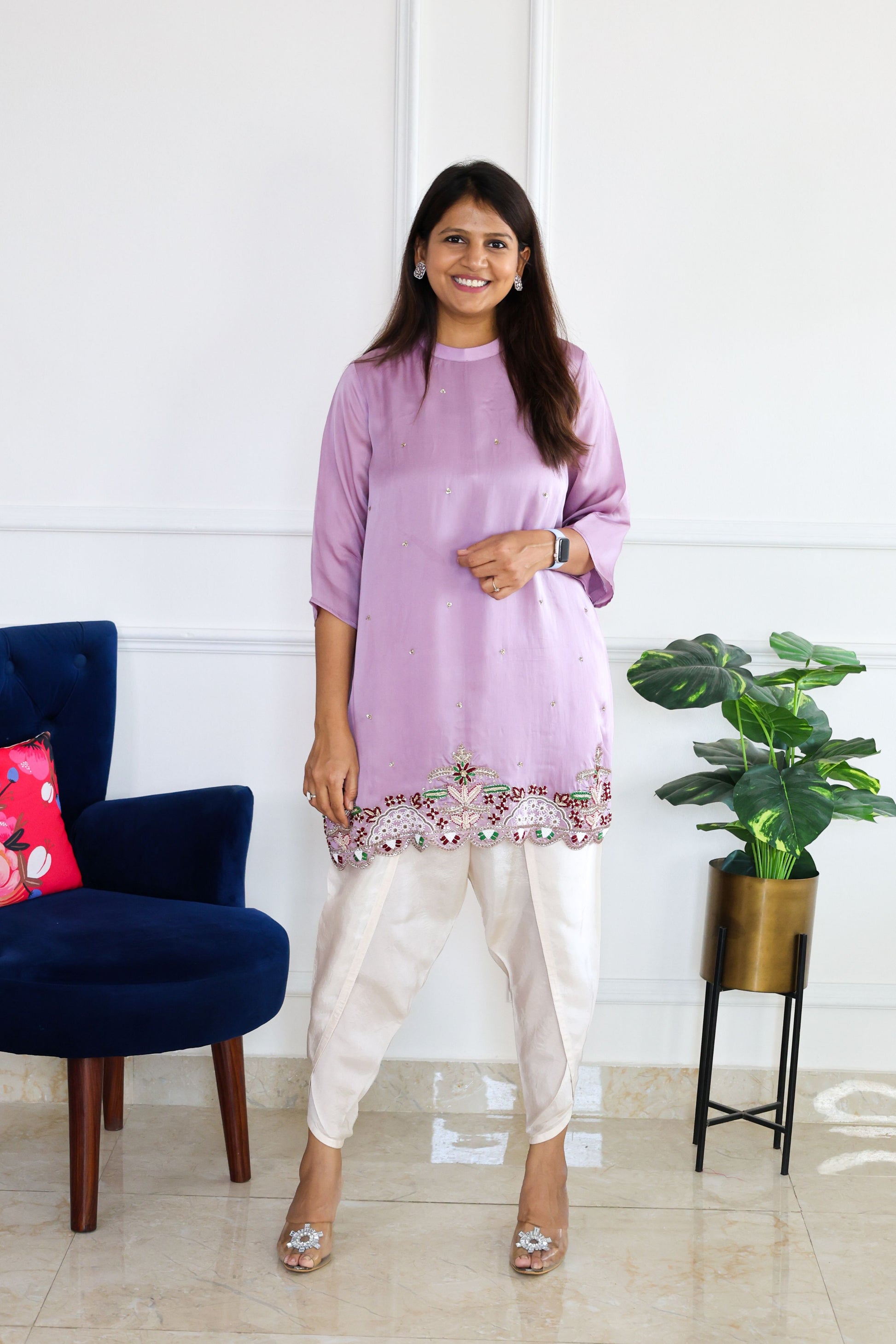 Seen here is our Satin organza top featuring intricate hand embroidery — a perfect pick for intimate festive occasions, paired effortlessly with dhoti-style tulip pants.