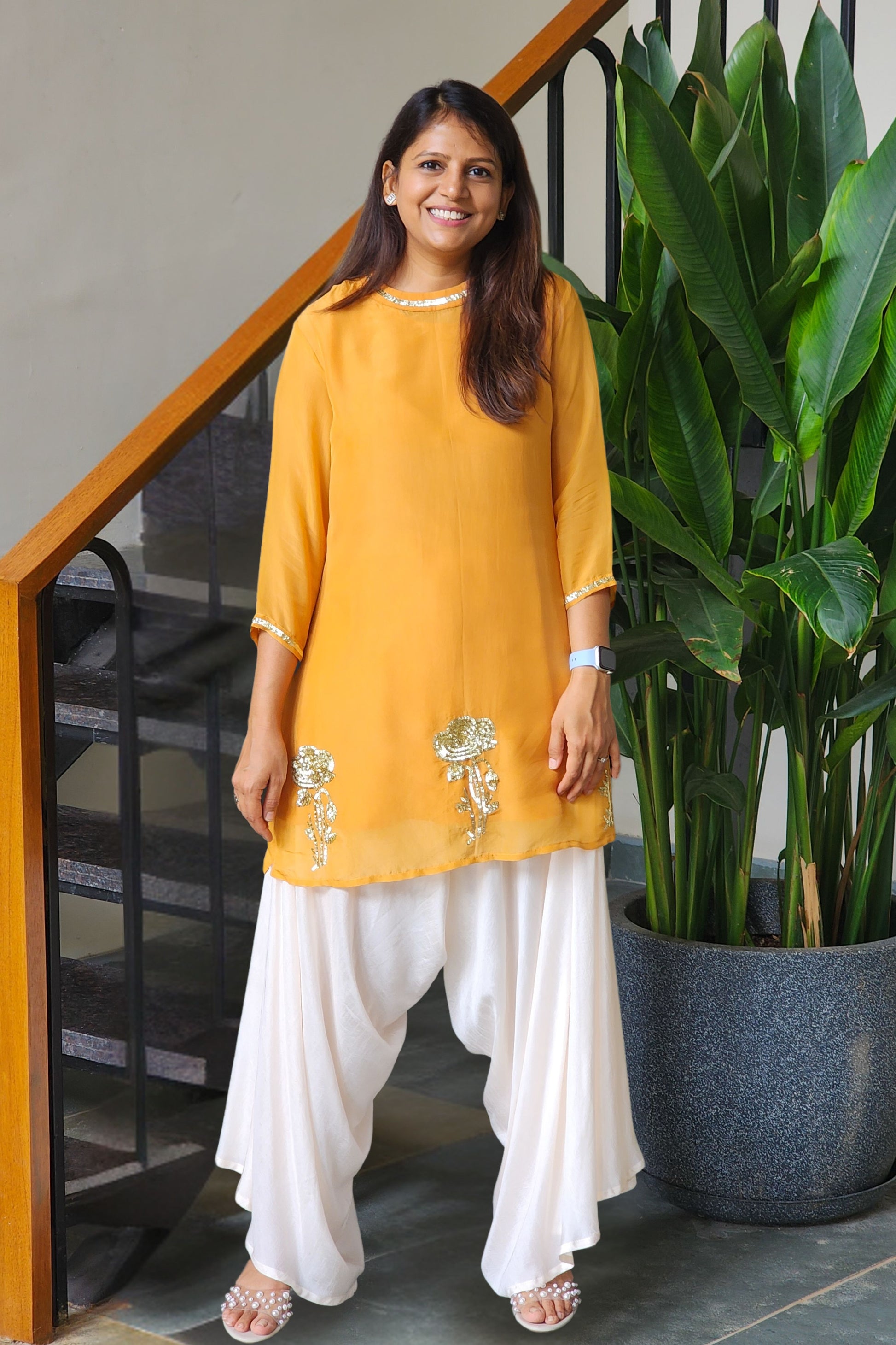 Seen here is soft organza kurta with flower hand embellishments at the hem, comes with boho style free size loose pants lining attached ! Can be Customised