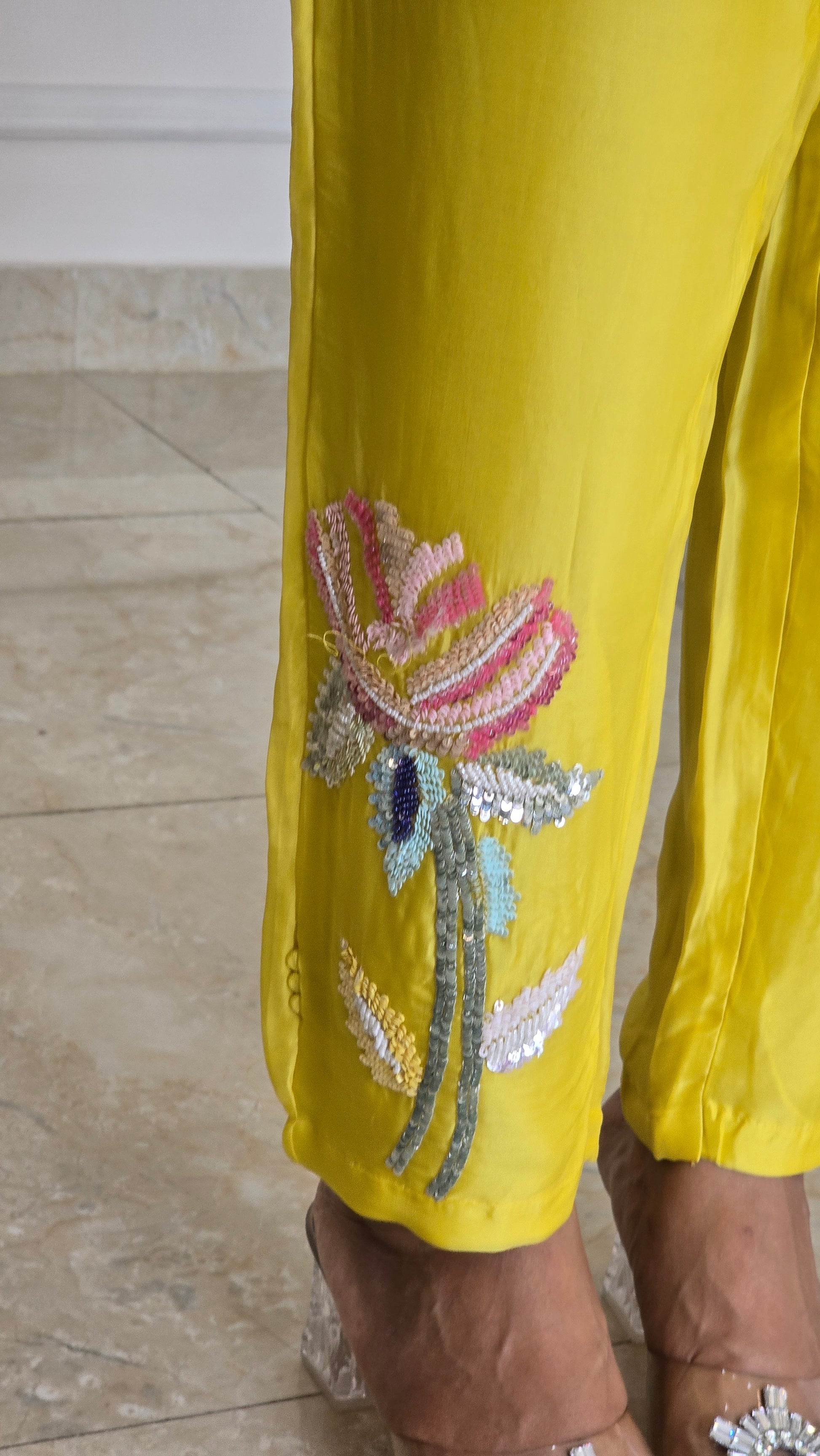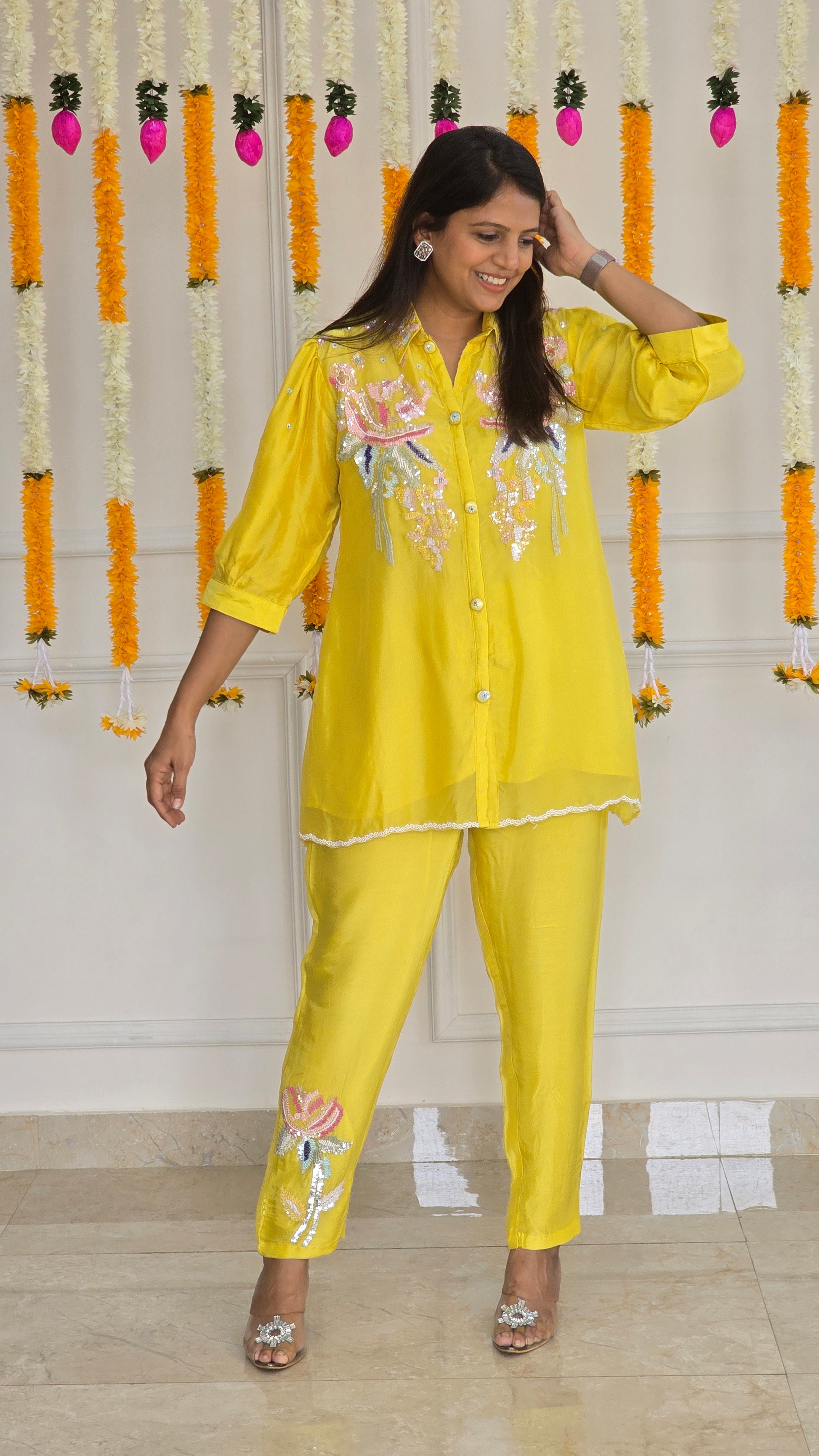Radiate festive cheer in the Marigold Sequins Bloom Co-ord Set, crafted in a vibrant yellow hue. The shirt features intricate floral embroidery with sequin highlights, adding a subtle shimmer to your look. Paired with matching pants adorned with delicate motifs, this breezy and elegant set is perfect for daytime celebrations or festive gatherings