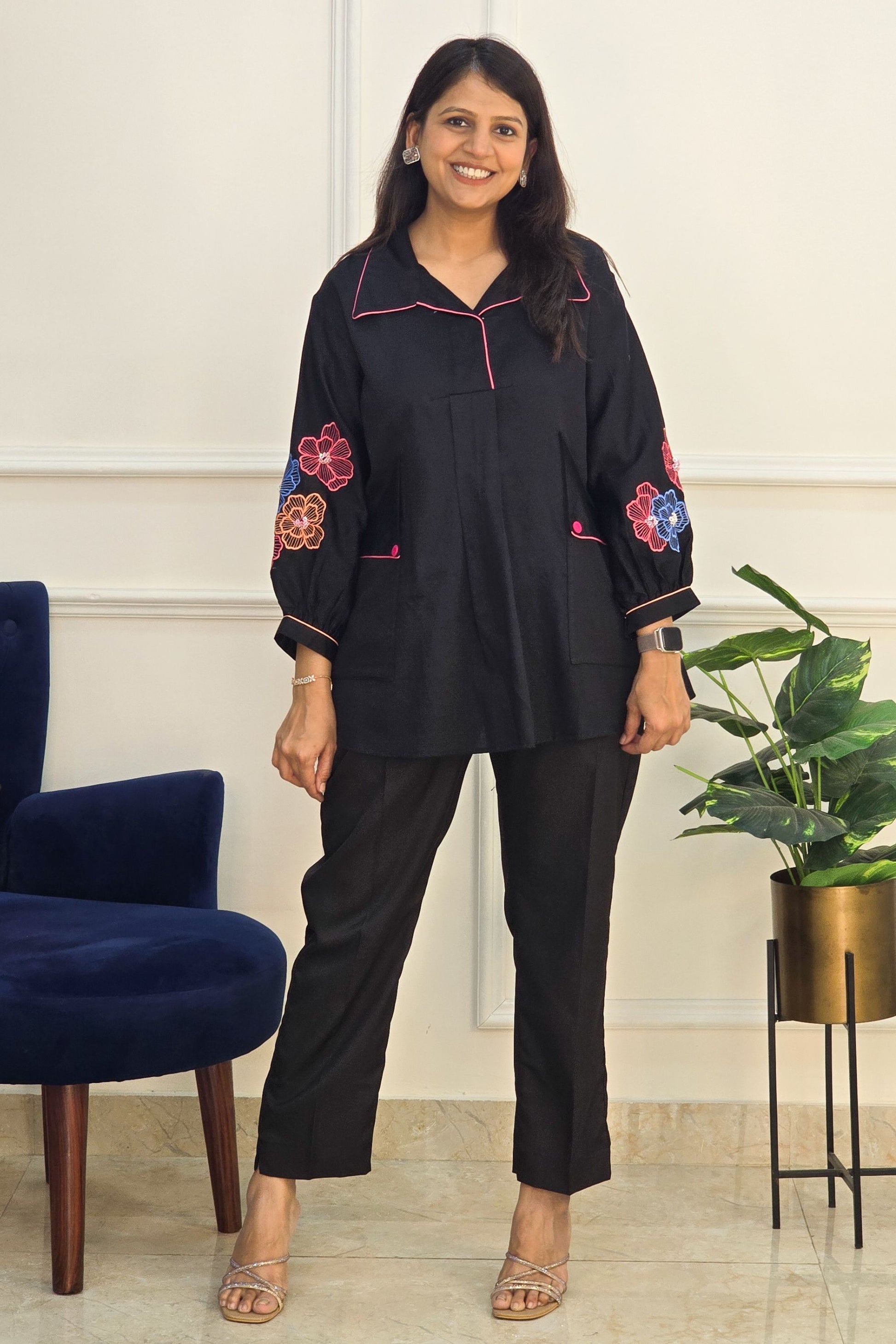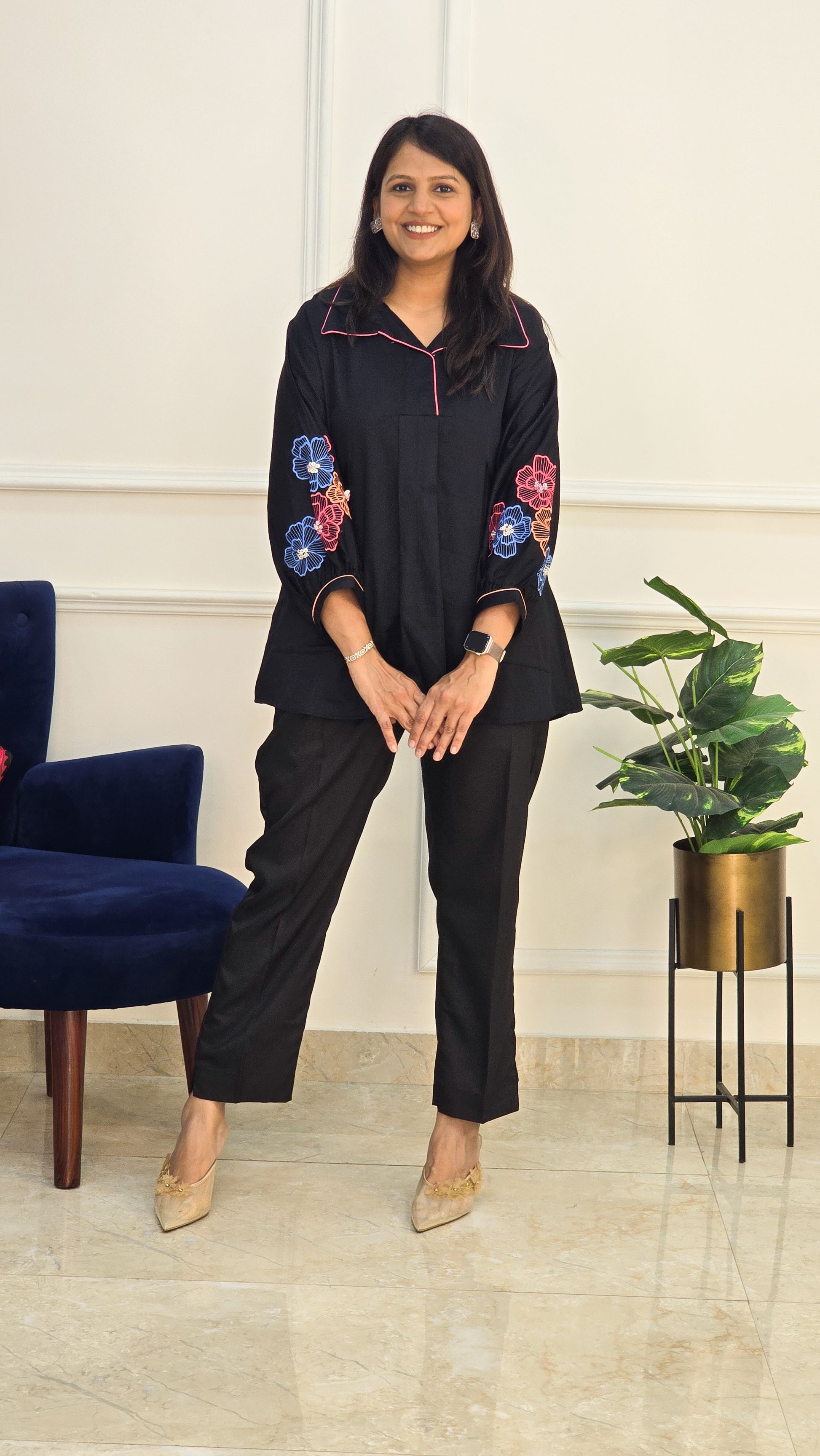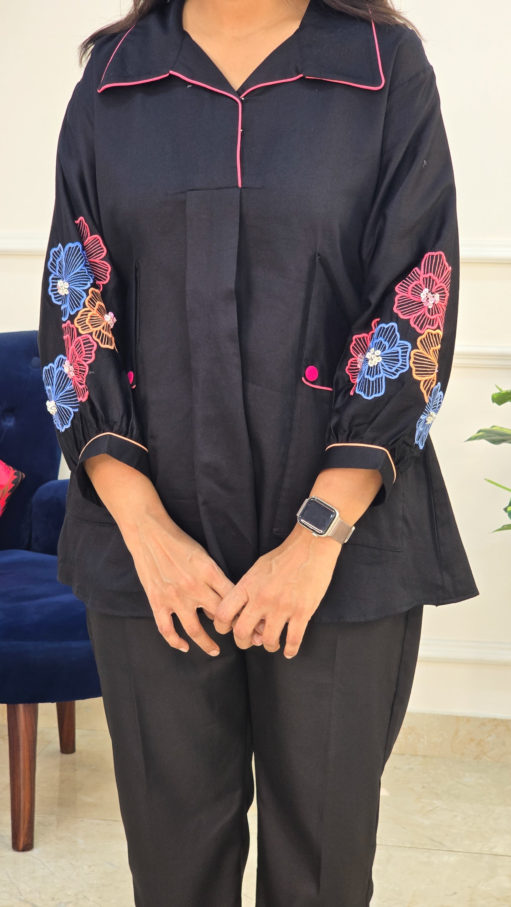 Chic black co-ord set with vibrant floral embroidery and contrast piping details.