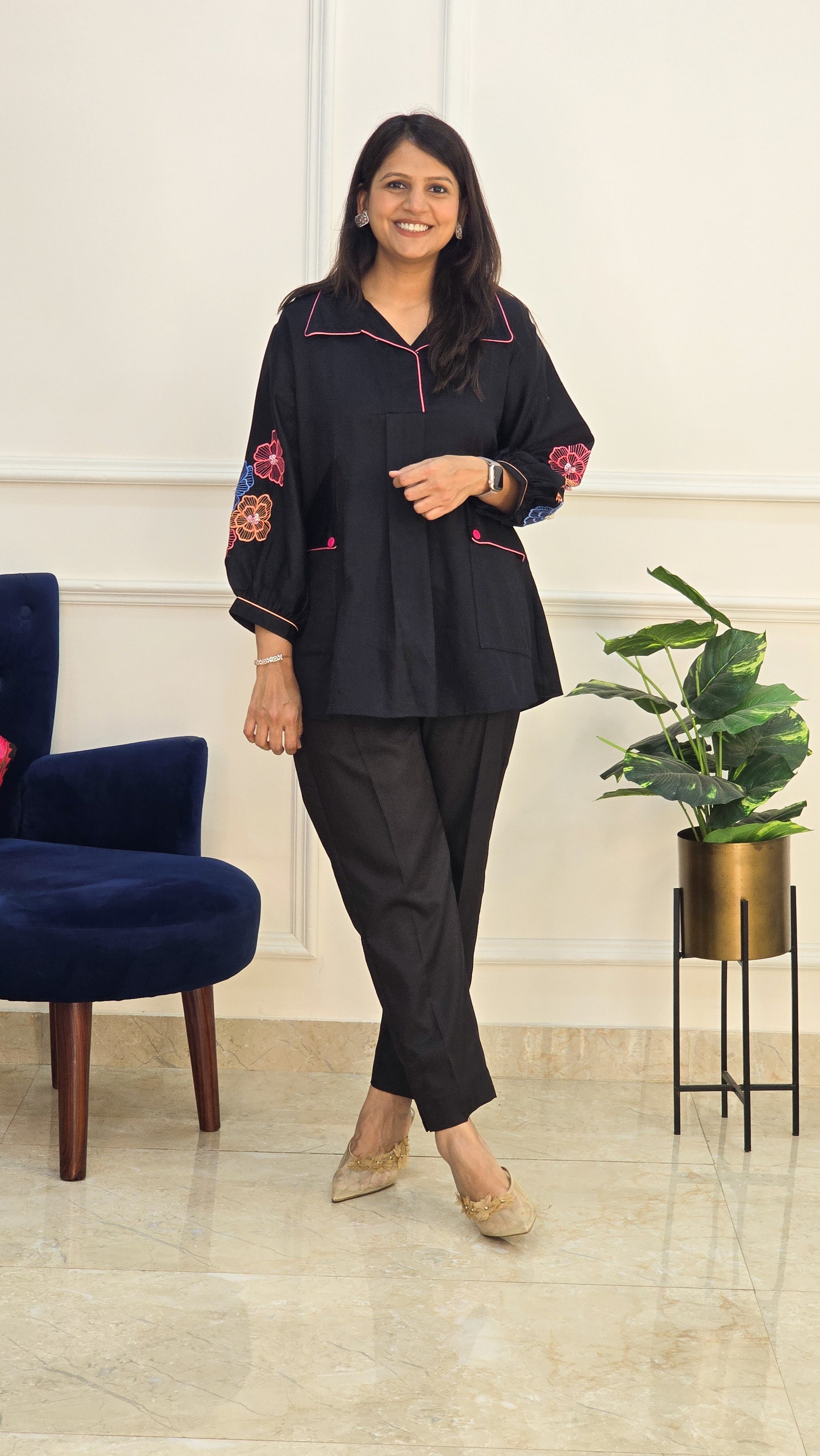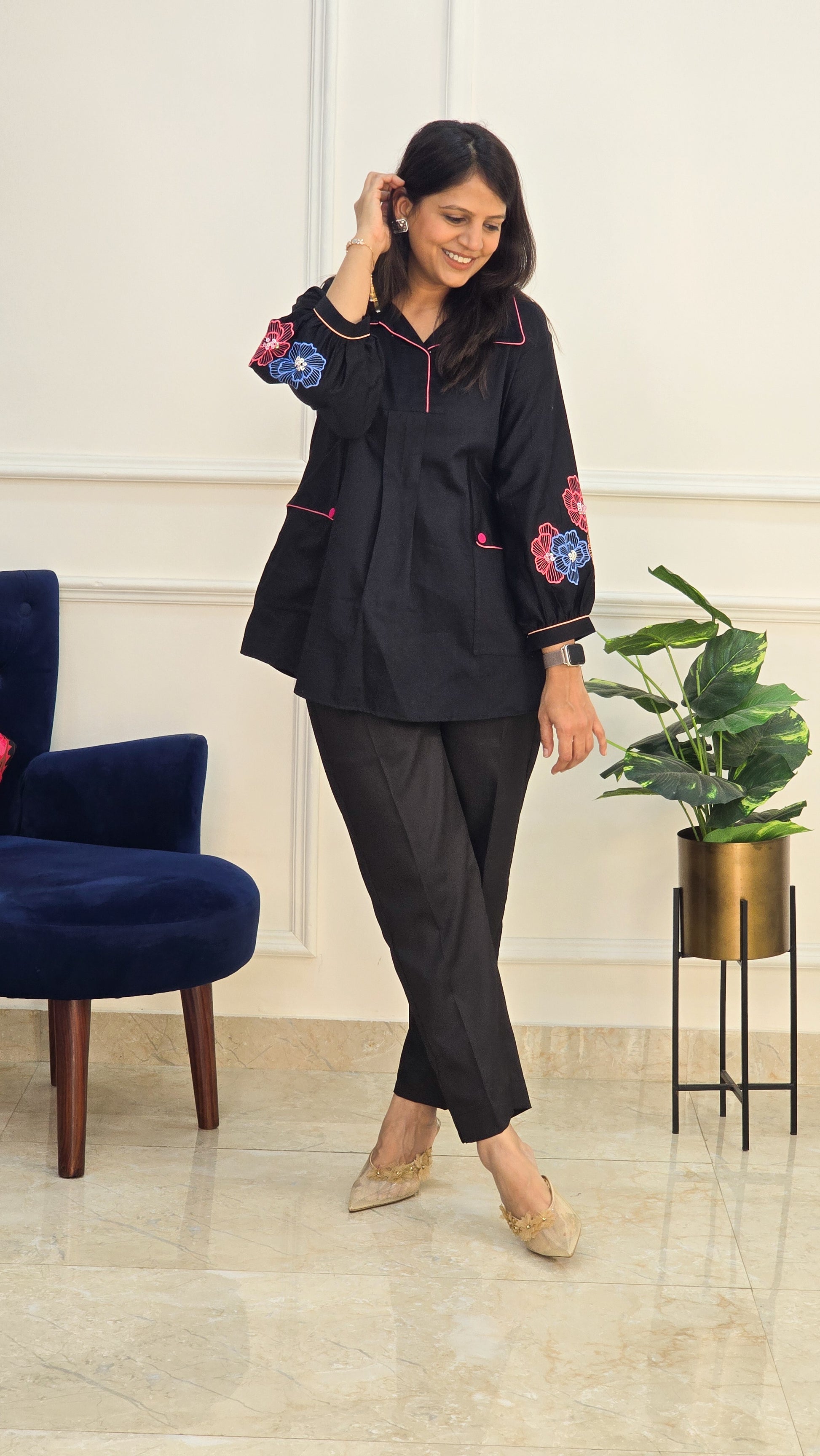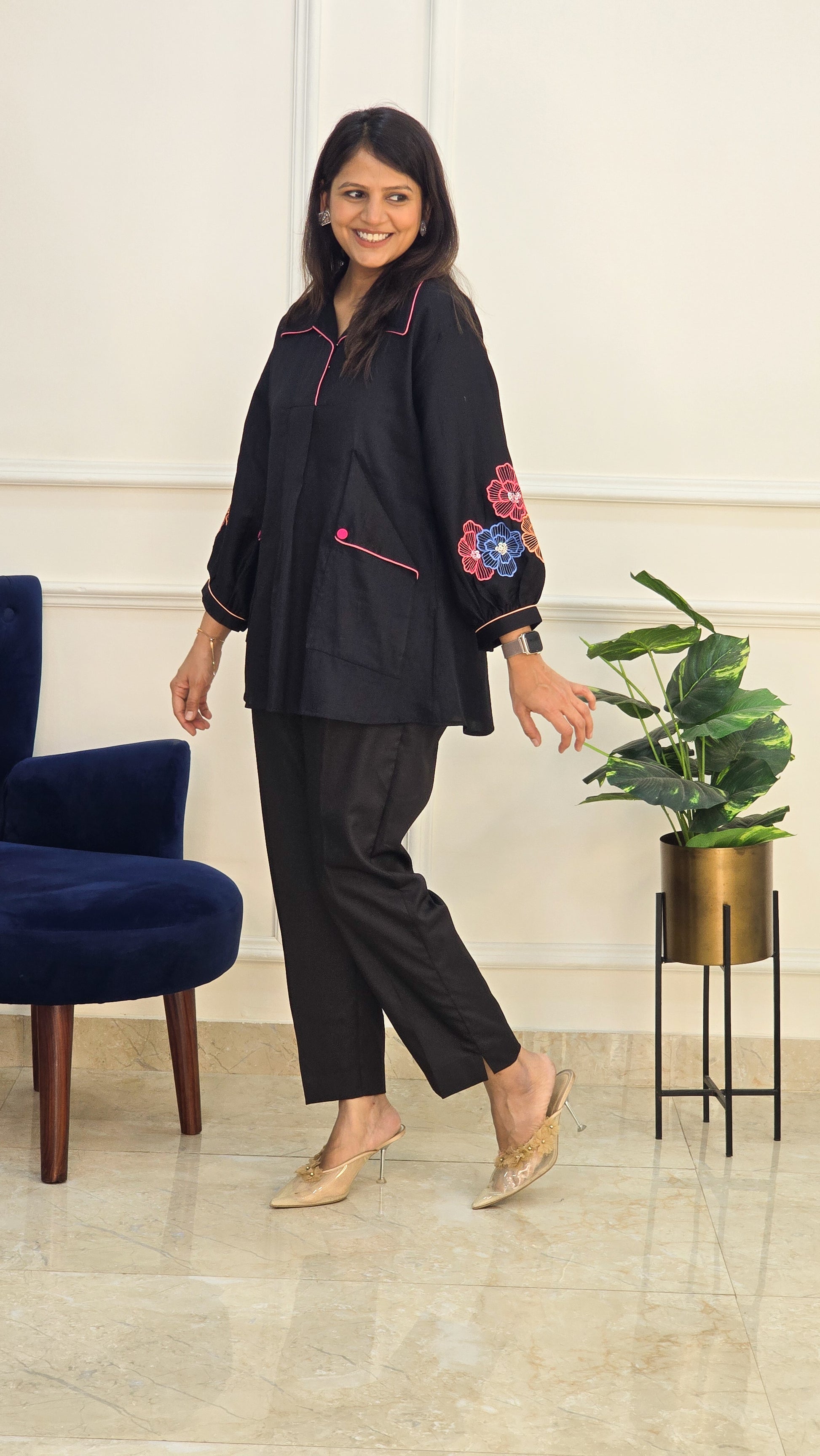 Chic black co-ord set with vibrant floral embroidery and contrast piping details.