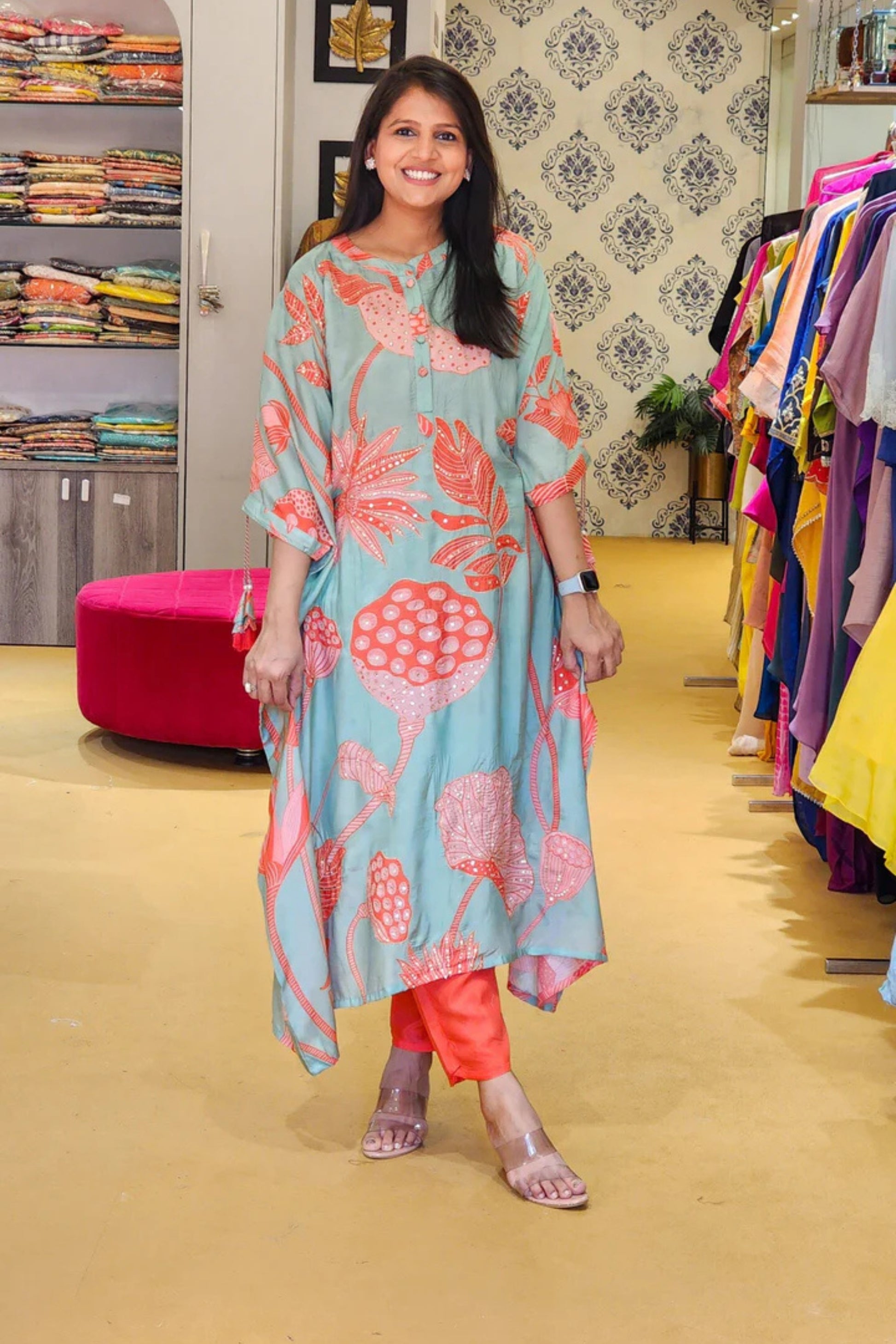 This is our floral Print muslin kaftan ensemble, which has hand embroidery throughout.