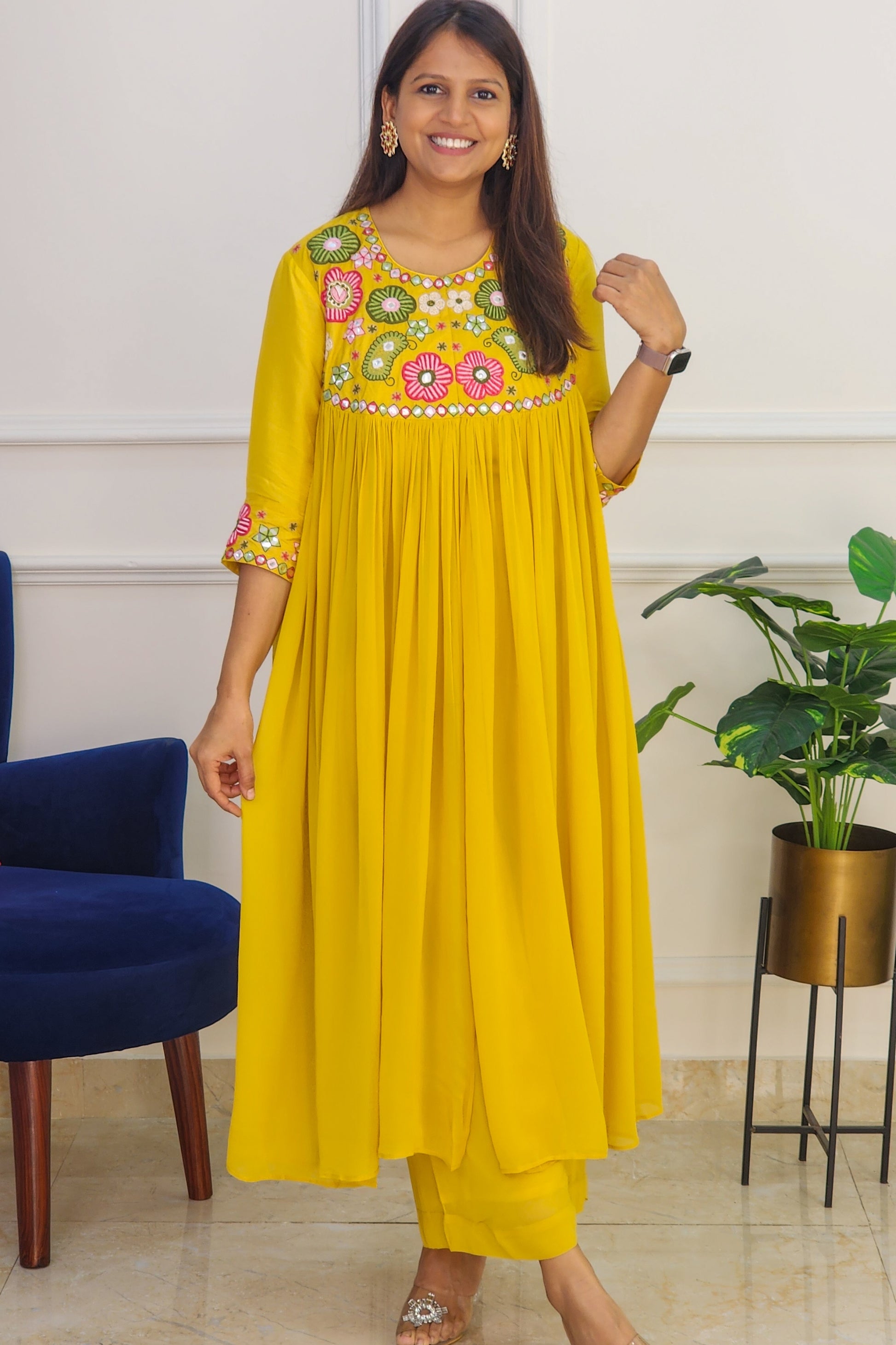 Seen here is a stunning georgette flared kurta featuring a center slit and intricate hand embroidery in vibrant threads. Paired with matching georgette flared pants, this ensemble is designed for elegance and comfort. The outfit includes an attached lining for added convenience, and the center slit can be easily closed for a more modest look if preferred.