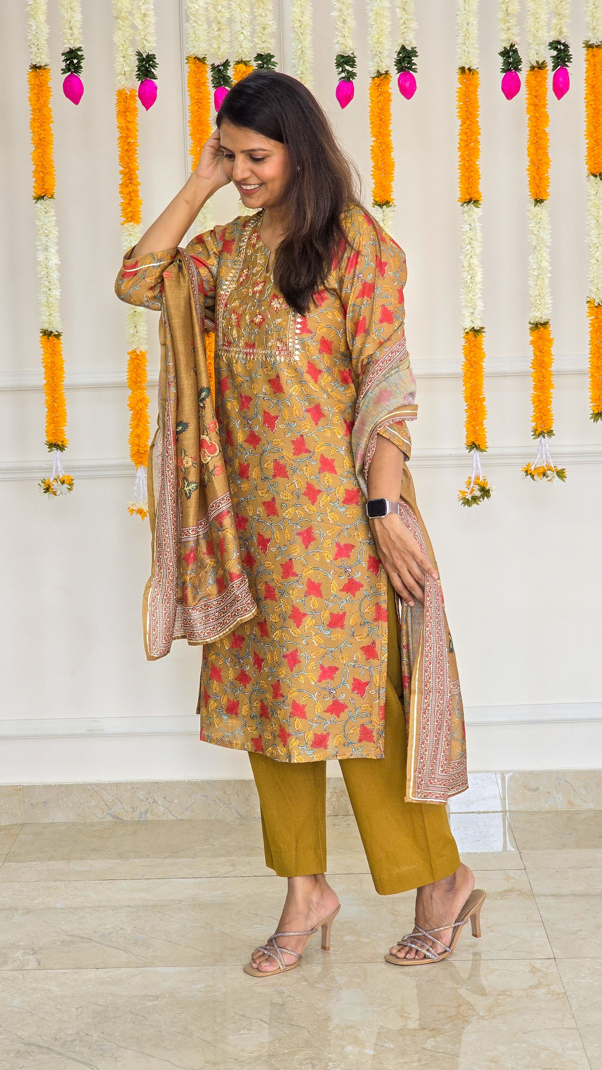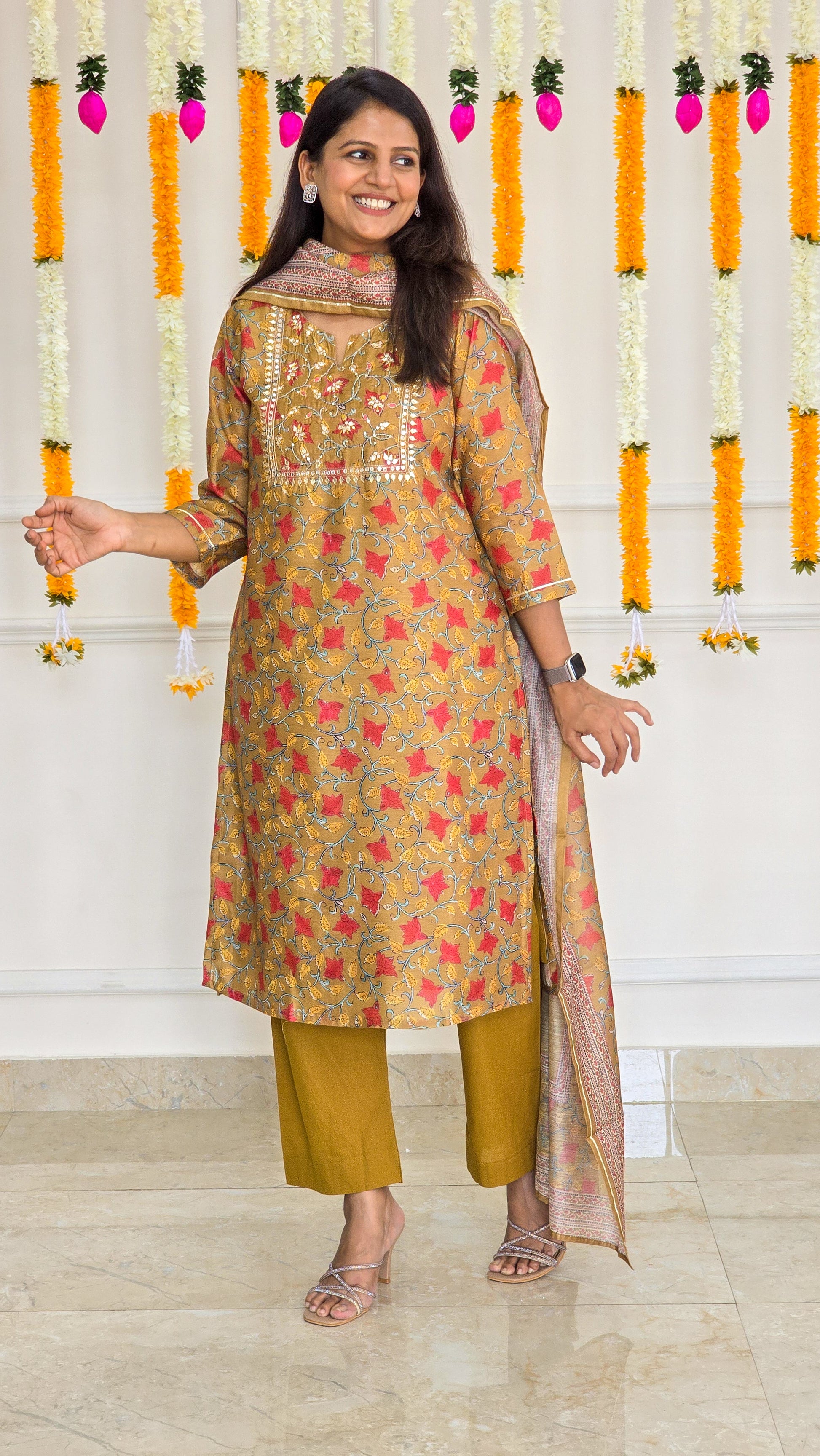 A timeless ensemble crafted in luxurious chanderi, featuring intricate kalamkari prints and delicate hand detailing. Paired with matching pants and a graceful dupatta, this set embodies refined elegance and traditional charm.