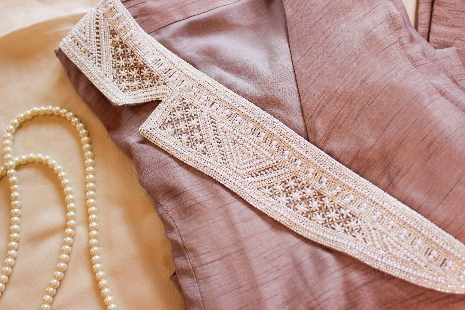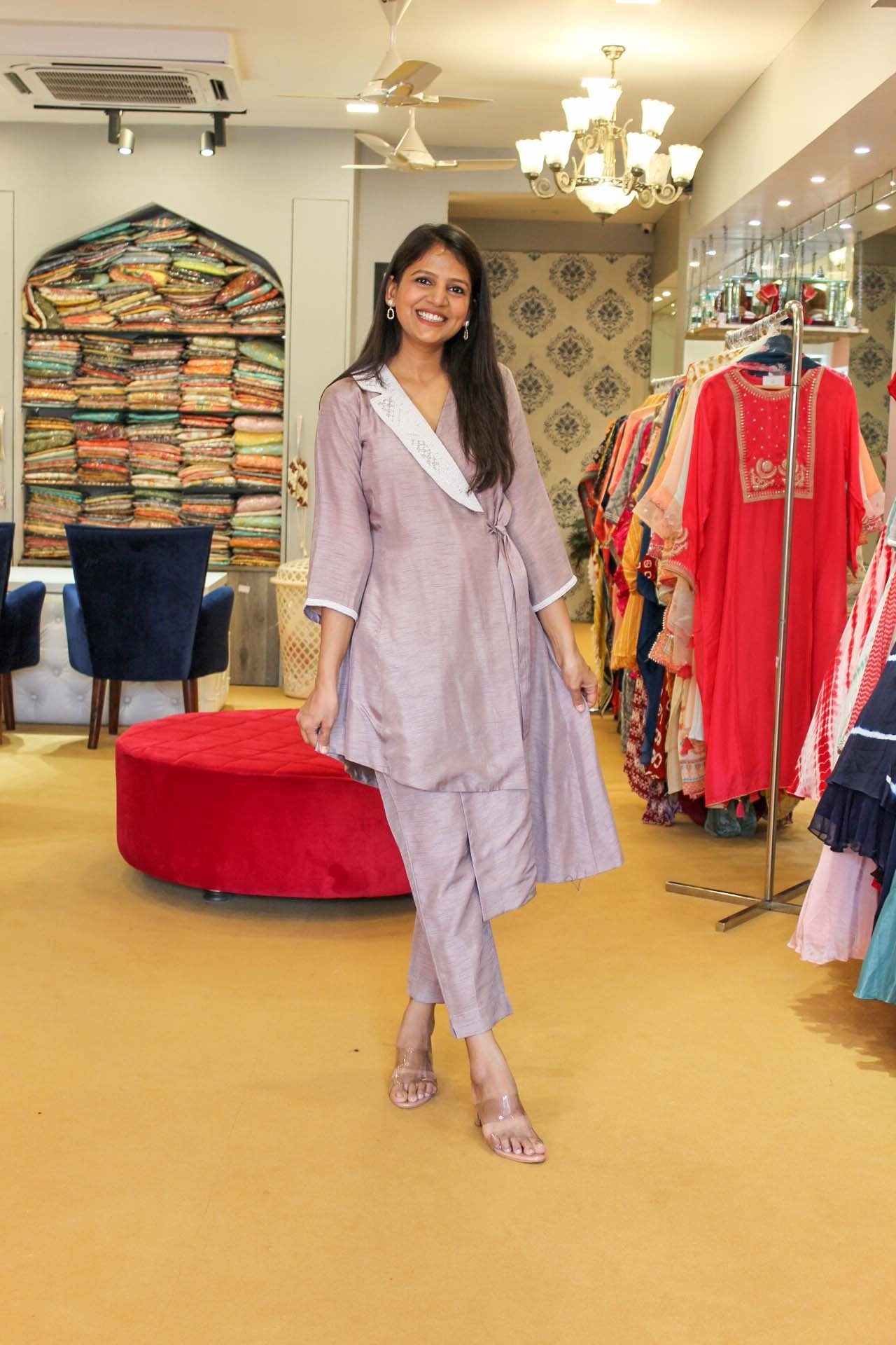 Fuss free statement silhouettes modern take with a touch of glamour and striking Hand embellishments ! Made on Dola silk fabric.