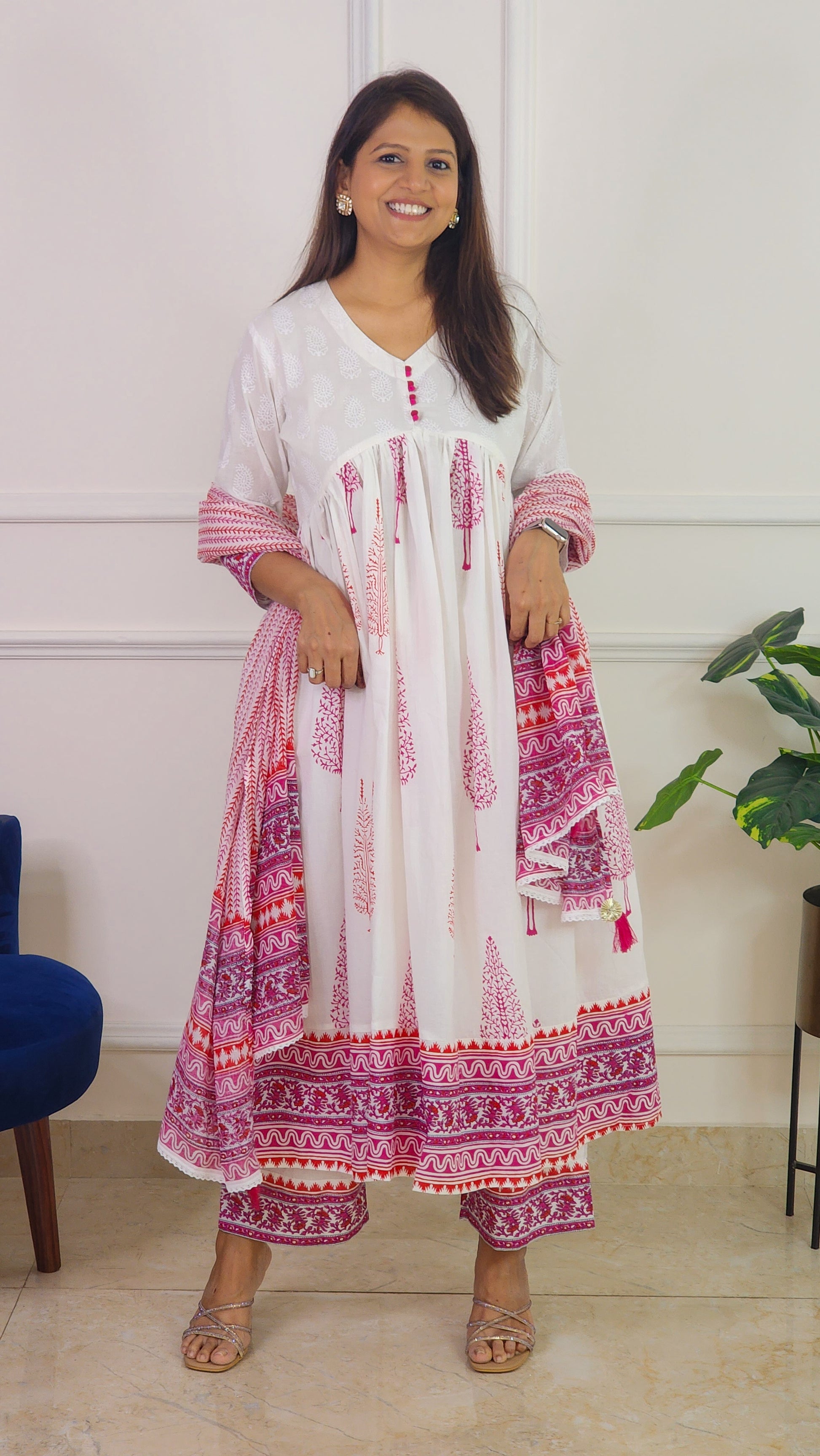 Seen here is pure cotton block kurta set with dupatta and pants in flare pattern !