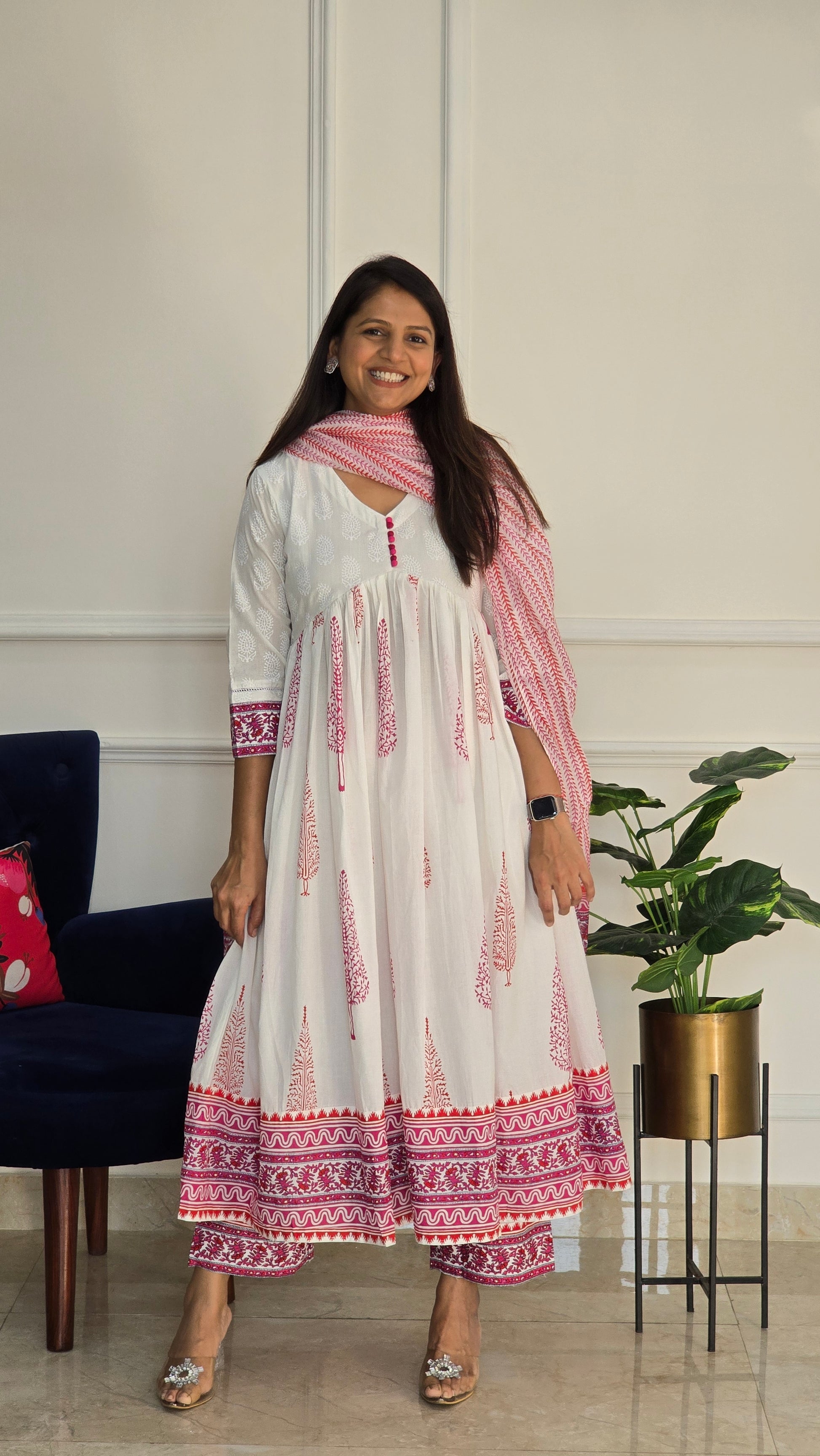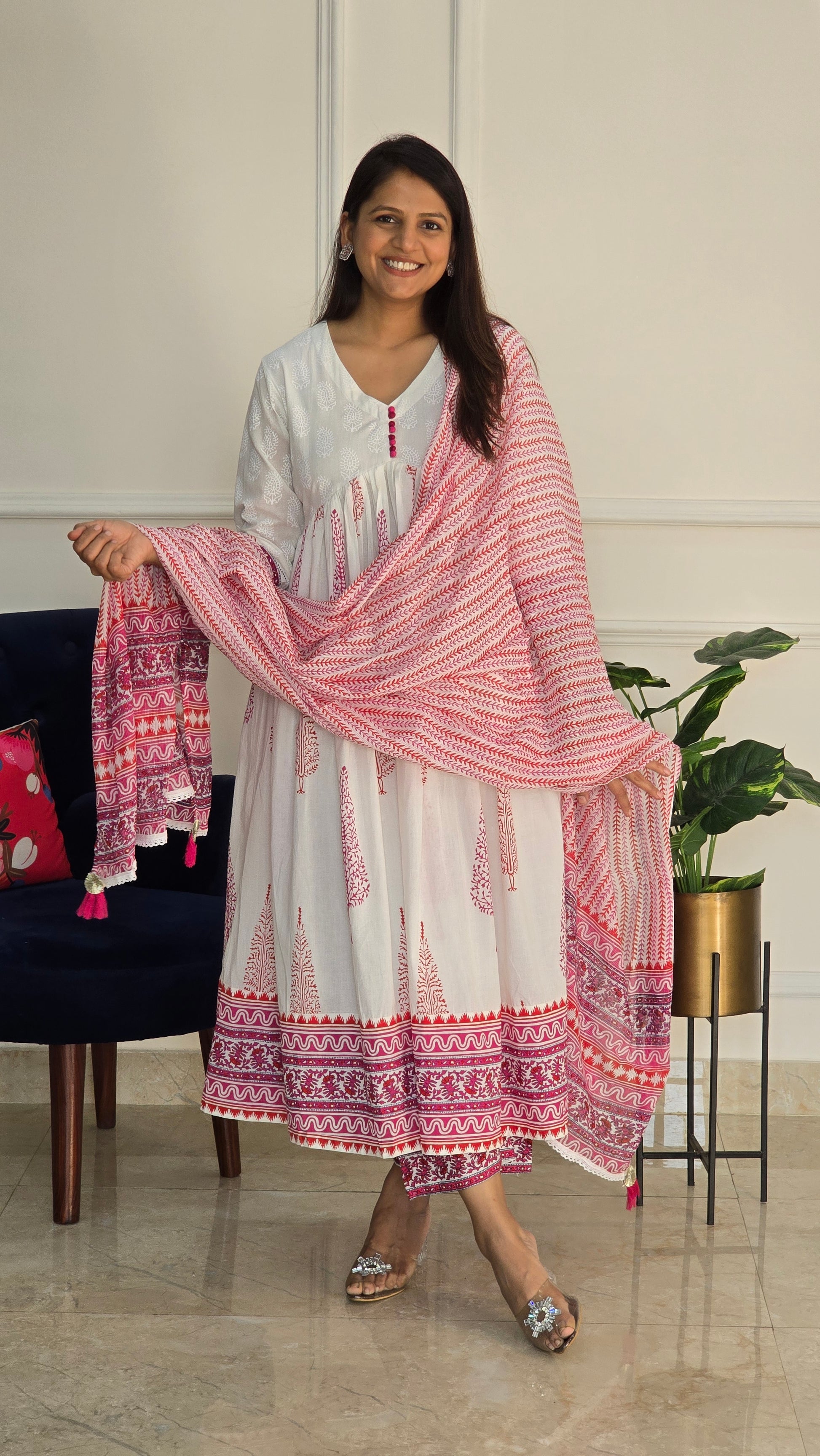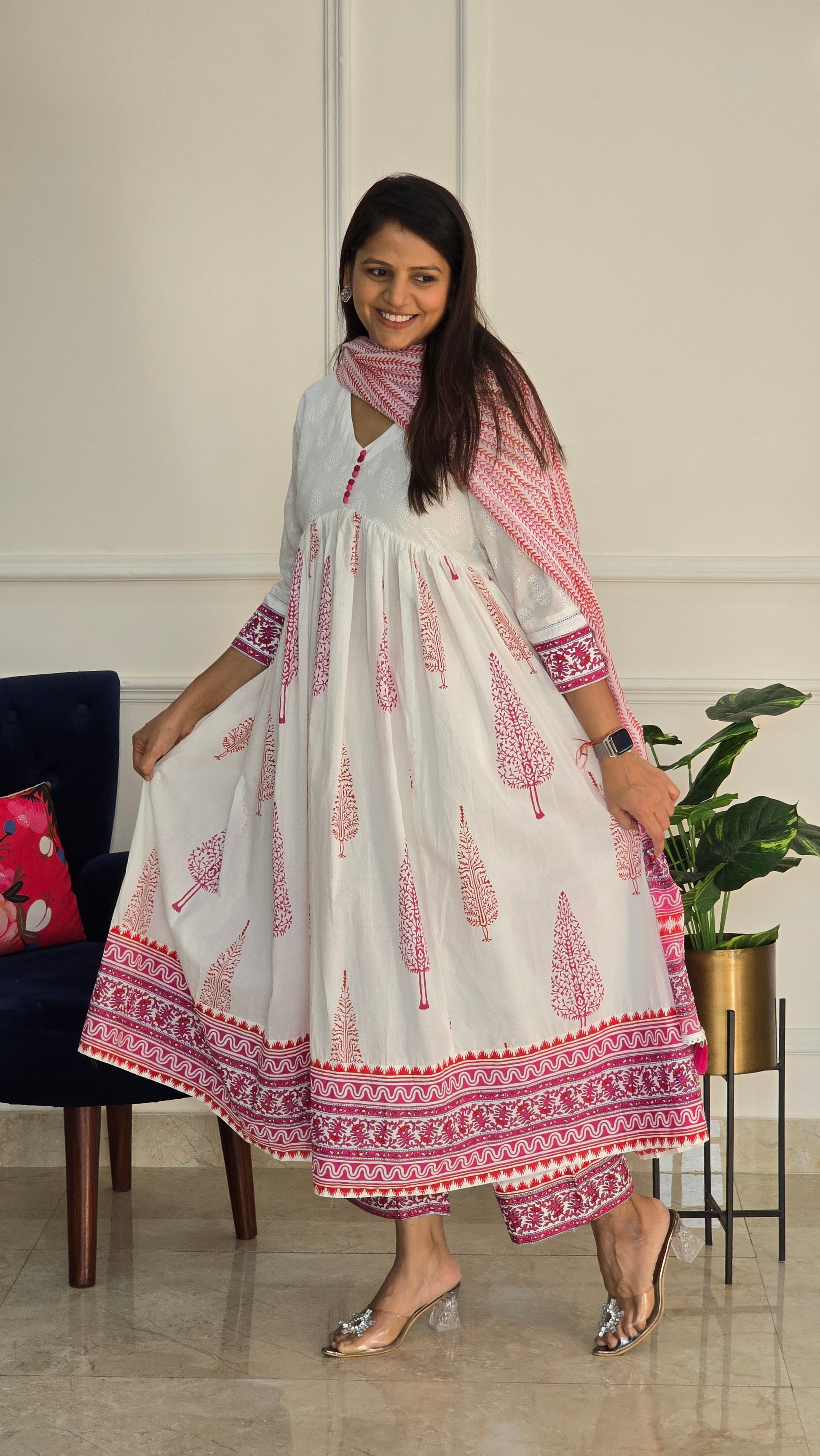 Elegant white Anarkali kurta adorned with delicate pink block prints and a graceful flared silhouette.