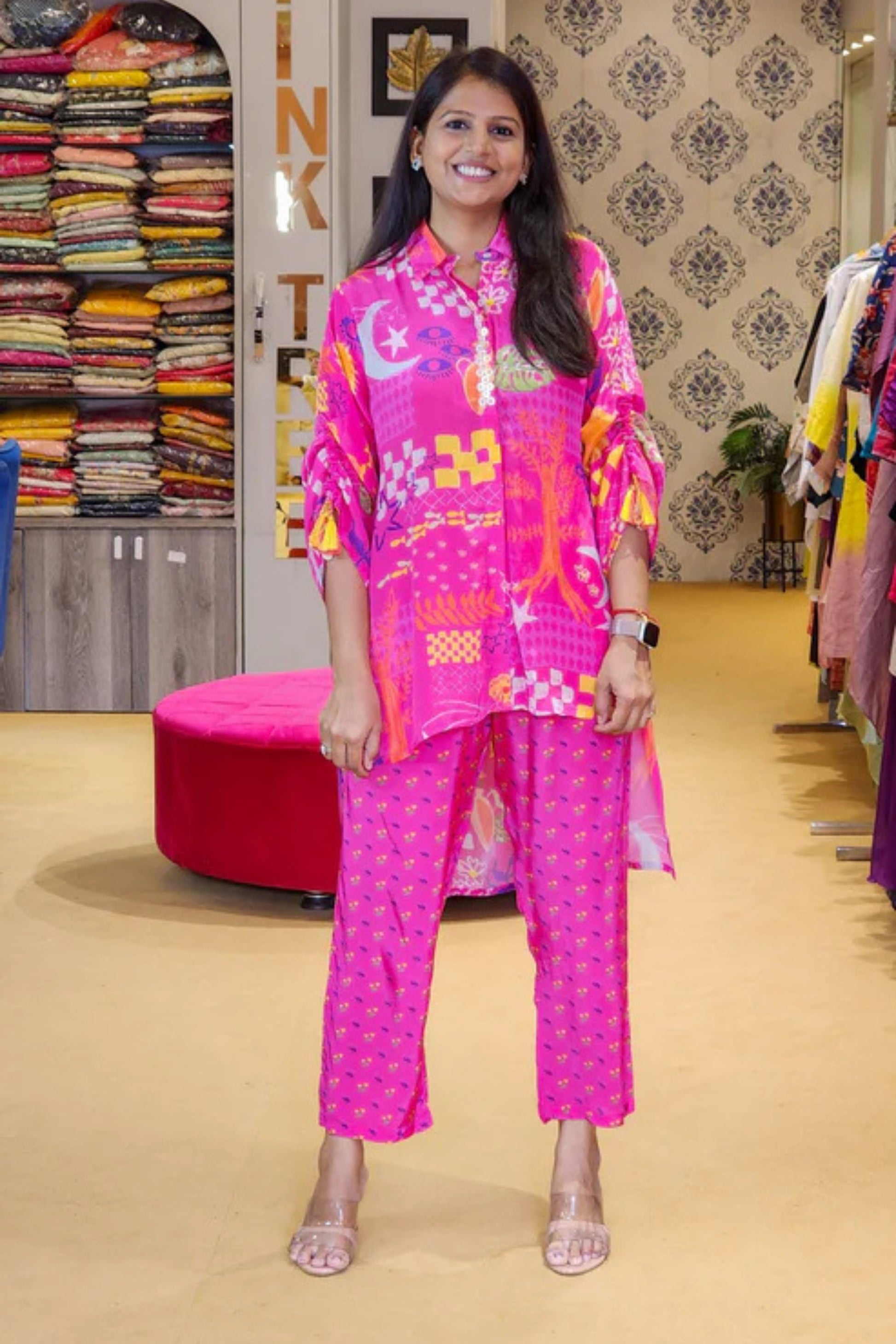 Elevate your style with our Crepe Co-ord Set, featuring a vibrant print that radiates fresh, lively vibes. Perfect for adding a pop of color and energy to your wardrobe, this set is designed for both comfort and effortless chic. Whether you're stepping out for a casual day or a special occasion, its playful pattern and breezy fabric make it the ideal choice for a stylish, feel-good look.