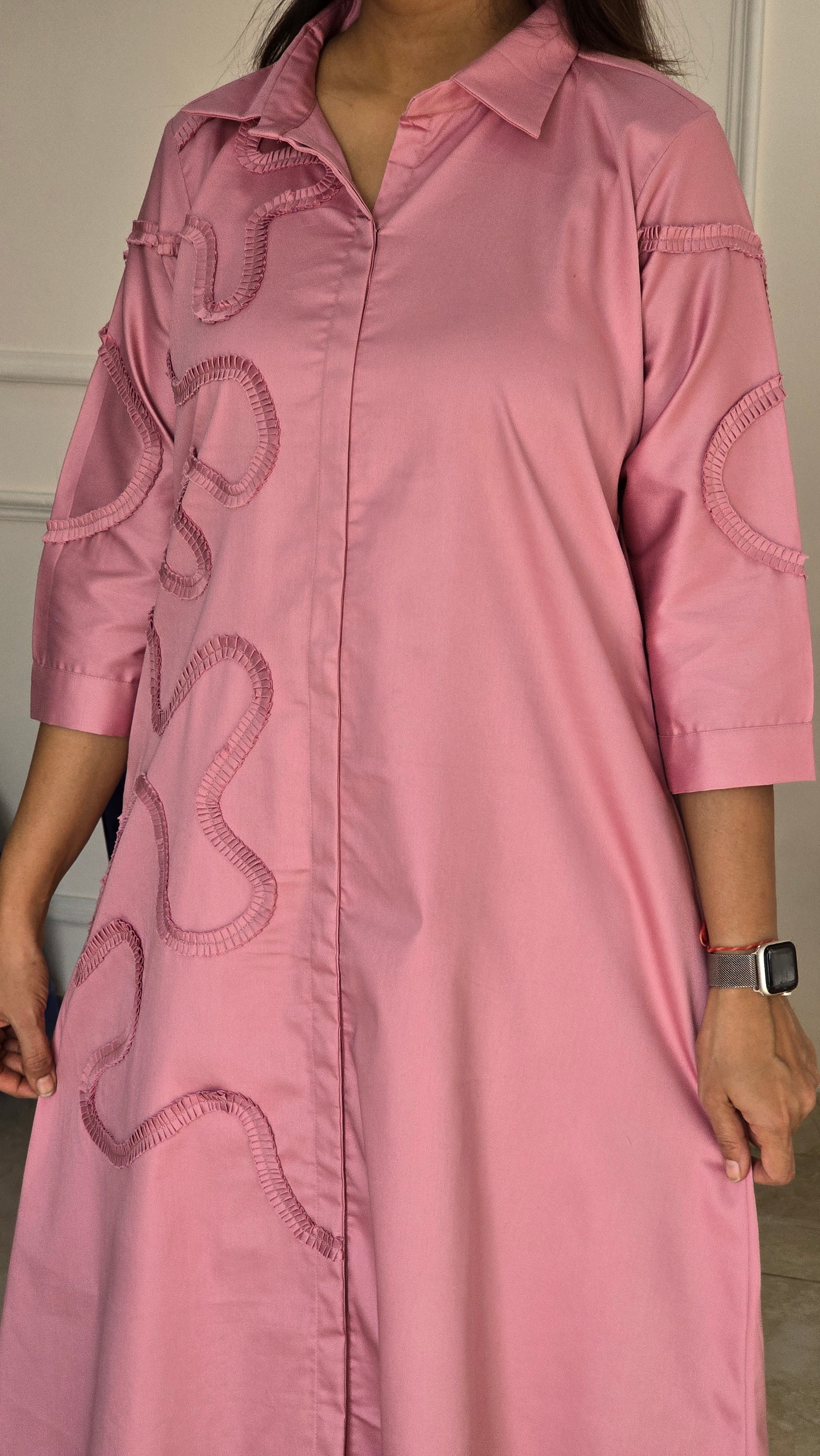 A stylish pink shirt dress with 3D fabric-manipulation detailing and a relaxed, easy silhouette—perfect for effortless everyday elegance.