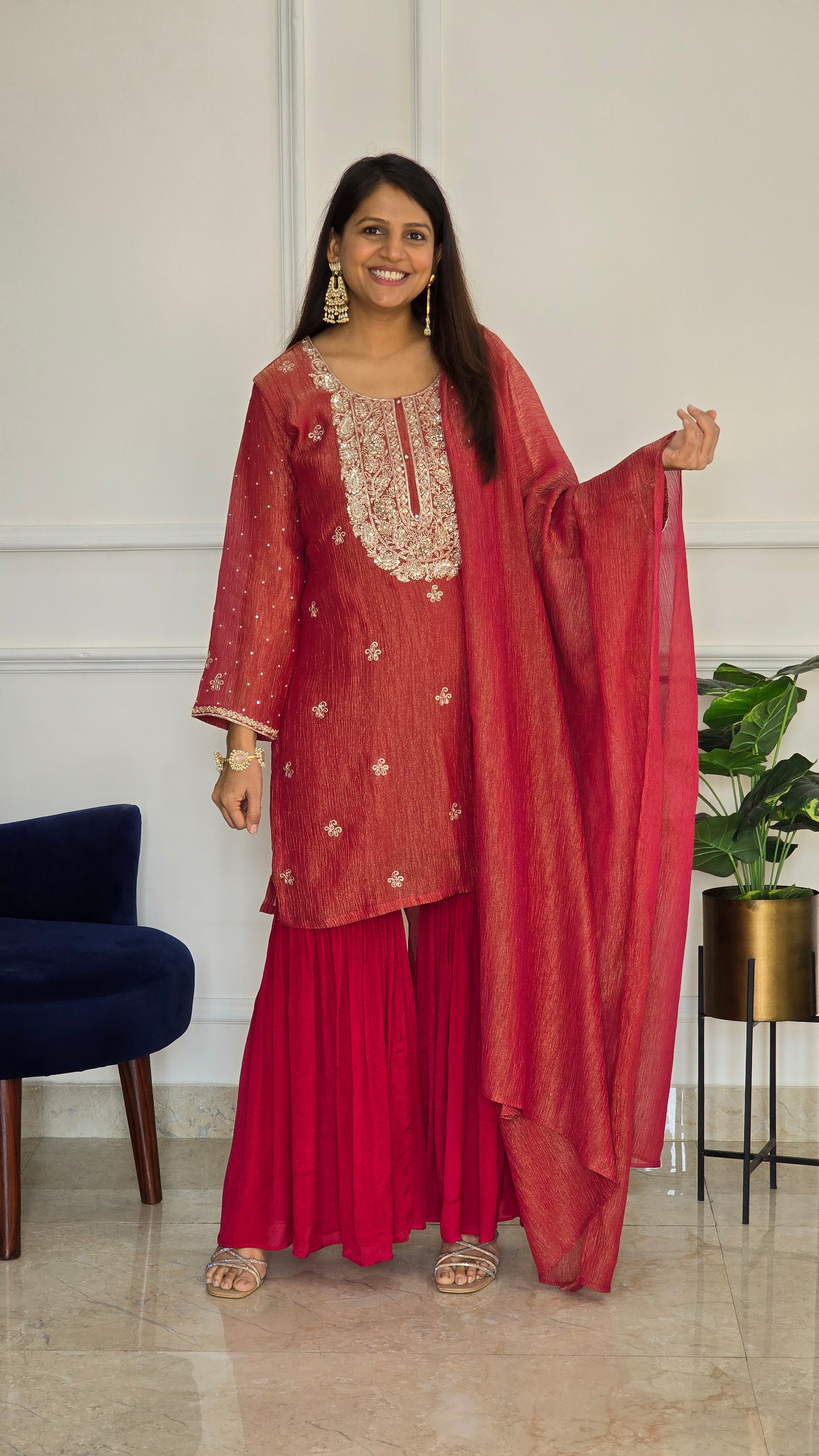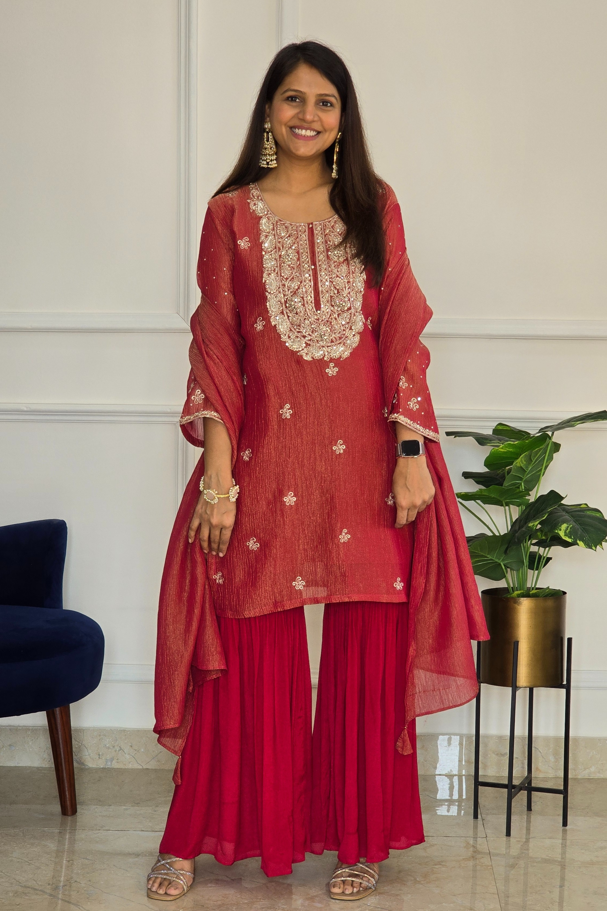 Rich red kurta set featuring an intricately embroidered yoke with subtle sequin detailing.