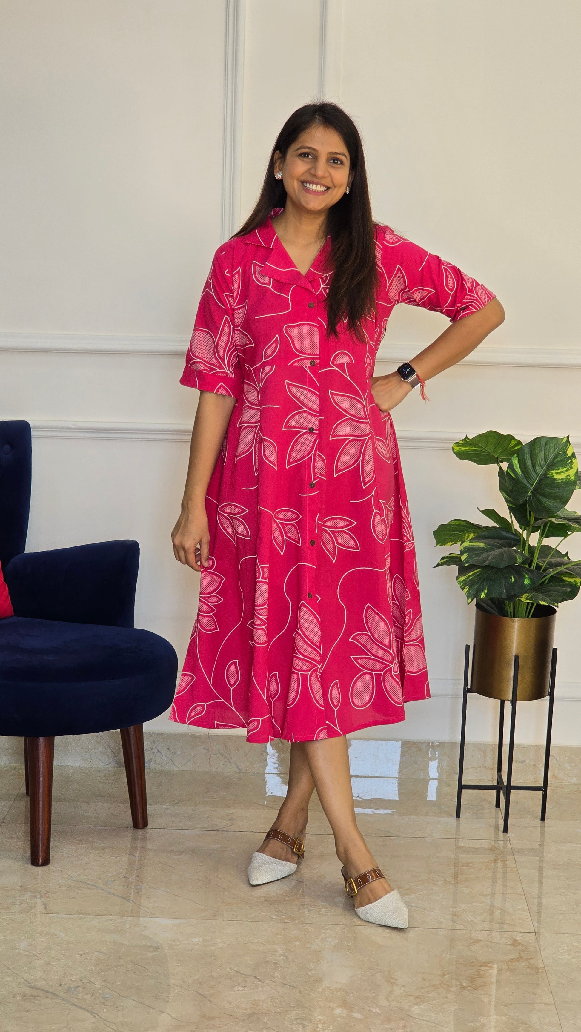 Bright pink floral tunic with a relaxed, flowy silhouette.