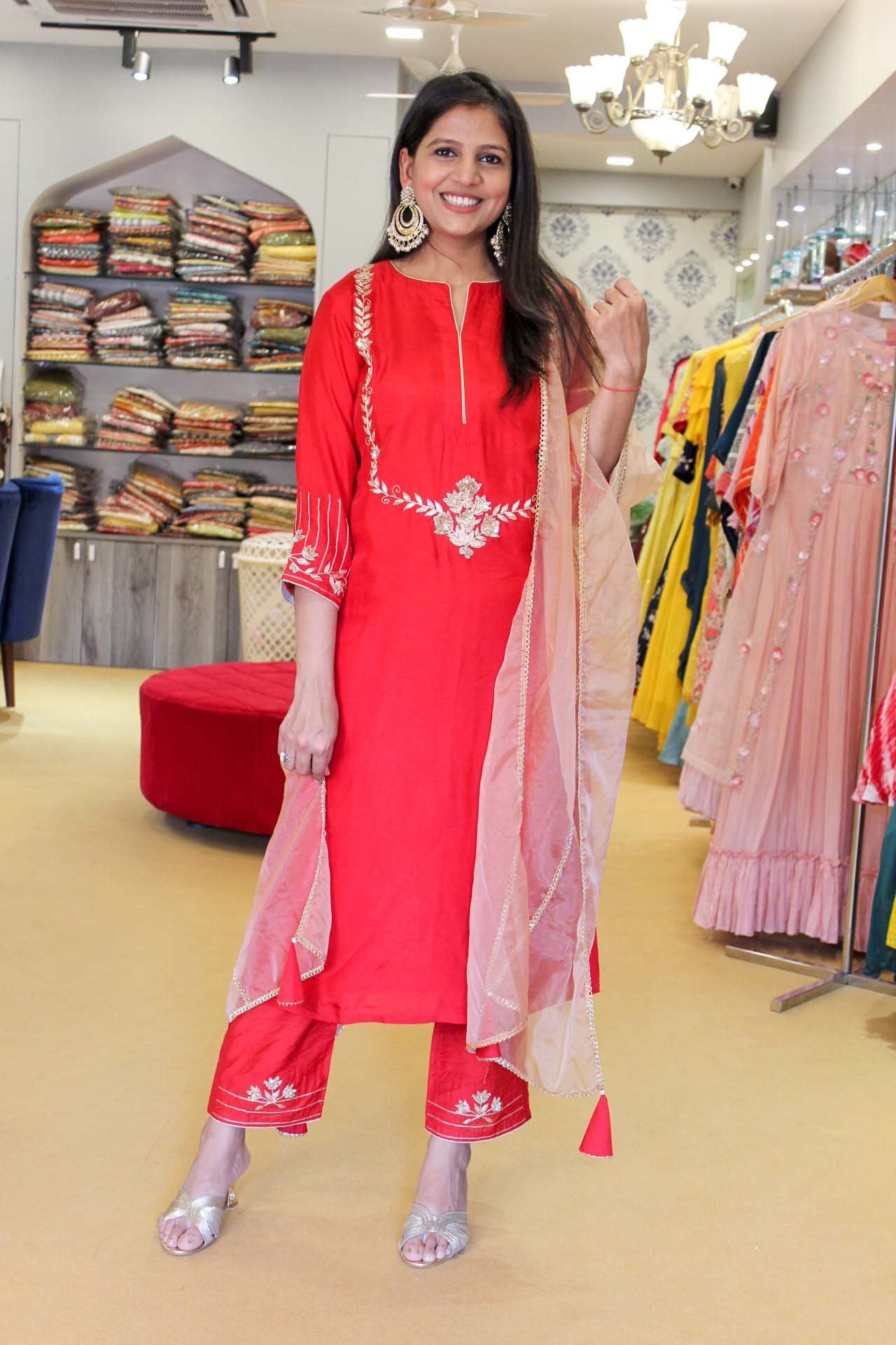 Grace any Occasion with our Red Gota Suit Set featuring detailed Hand Marodi with Gota and Zardosi Highlights.