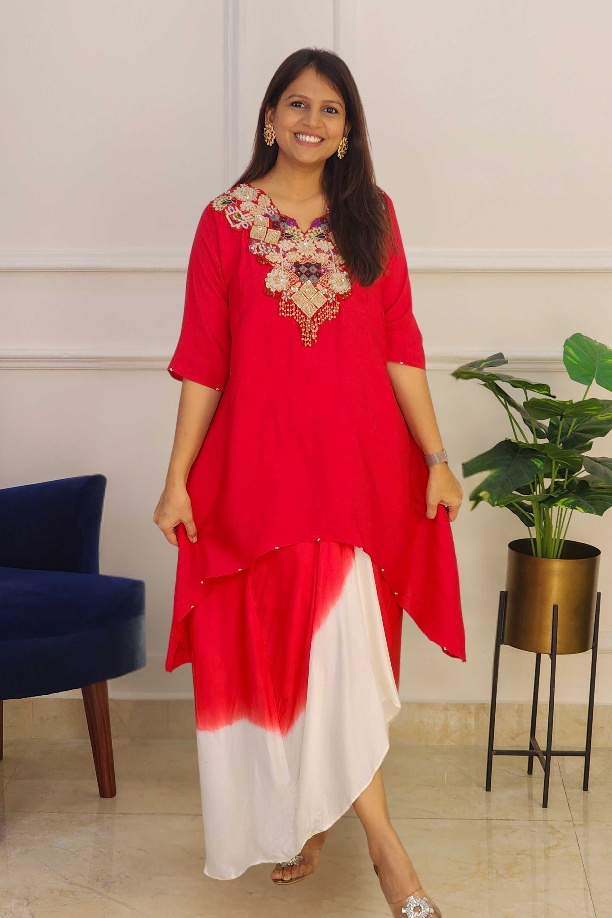 Presenting our exquisite crepe drape skirt with a mesmerizing ombre effect, paired with a loose-fit top adorned with intricate, handcrafted detailing. This ensemble is the epitome of elegance, making it a perfect choice for wedding festivities and celebrations.