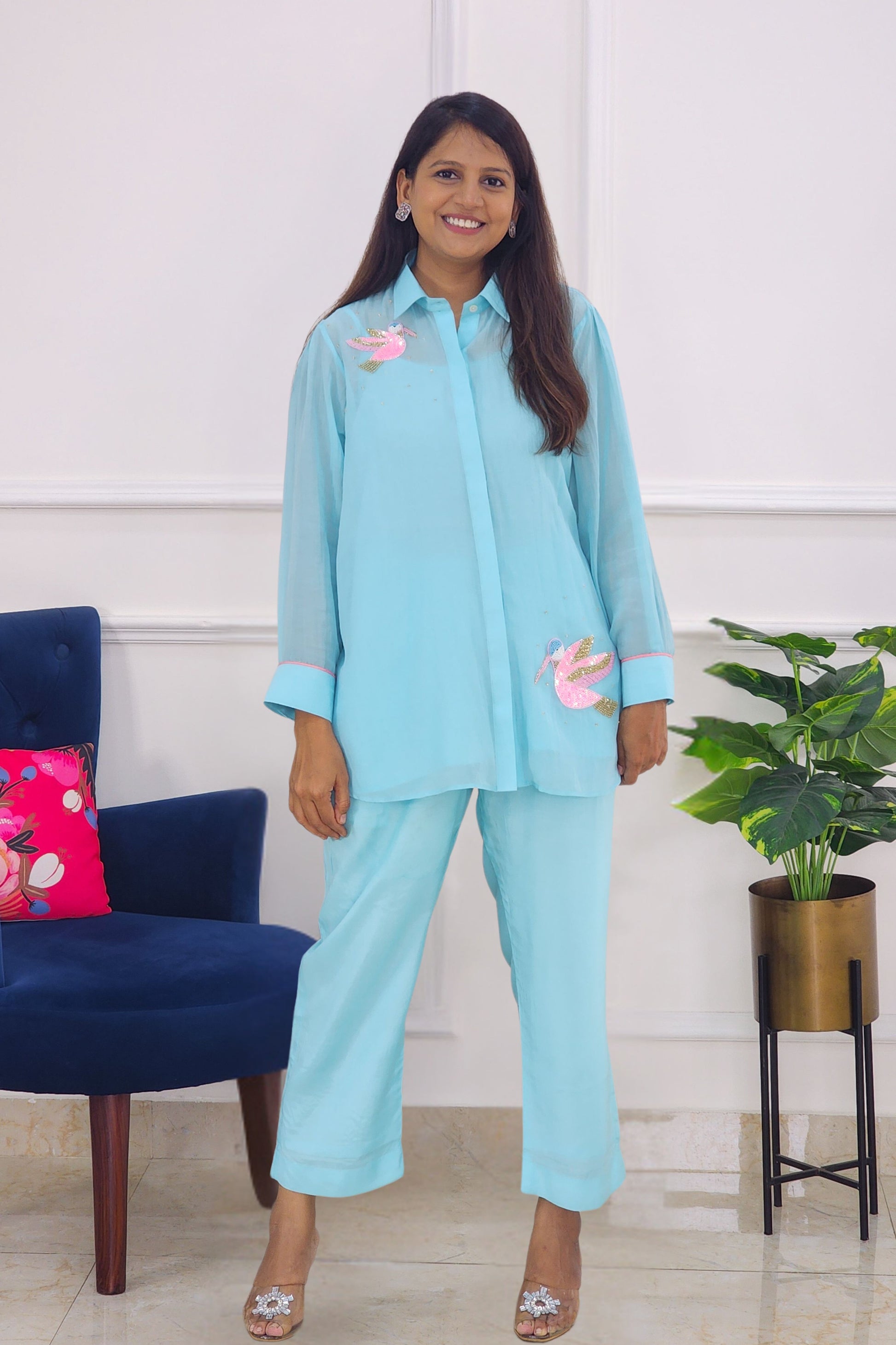 Sky Blue Bird Detailing Mul Chanderi Co Ord Set